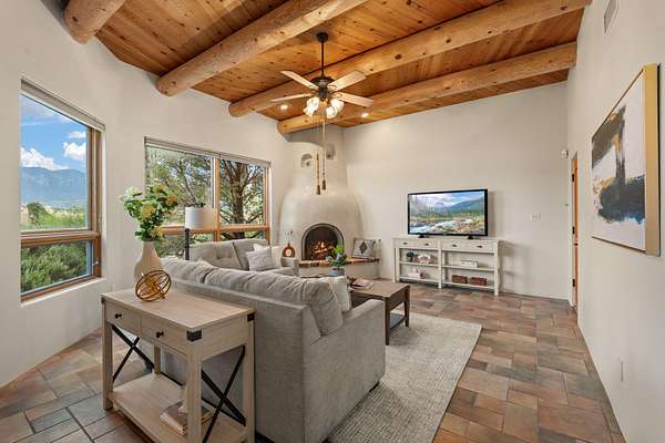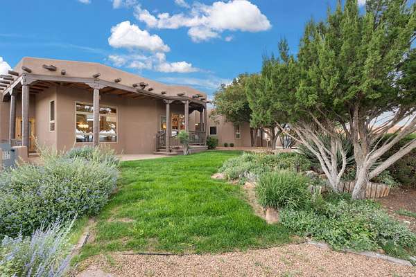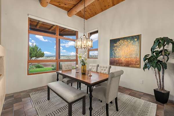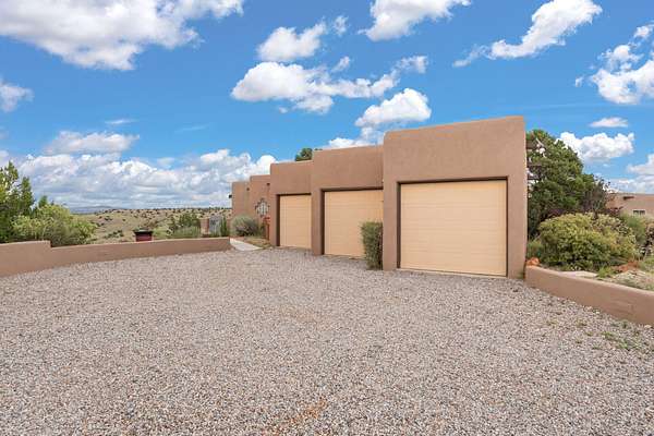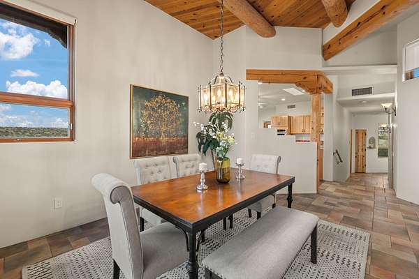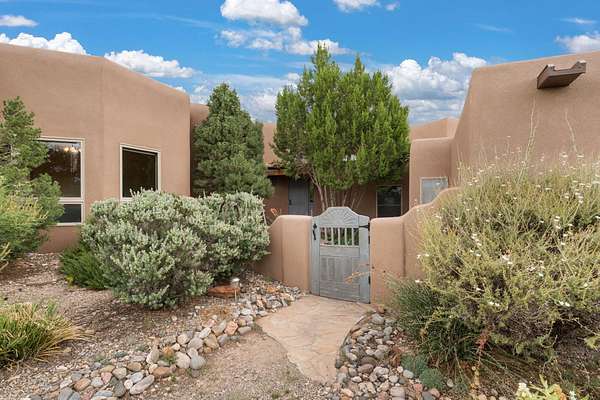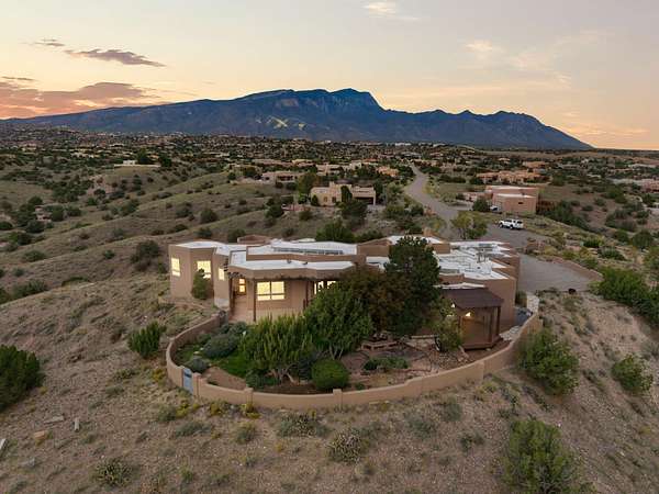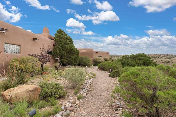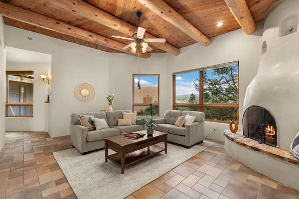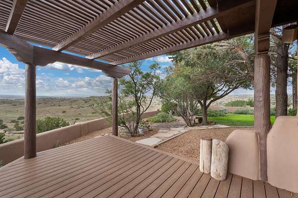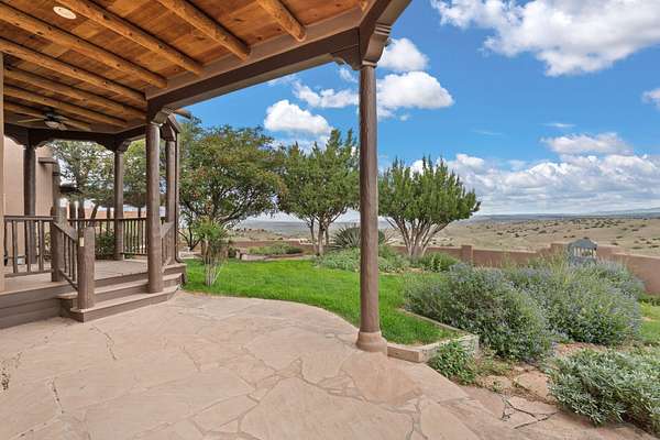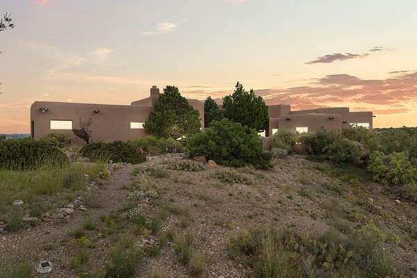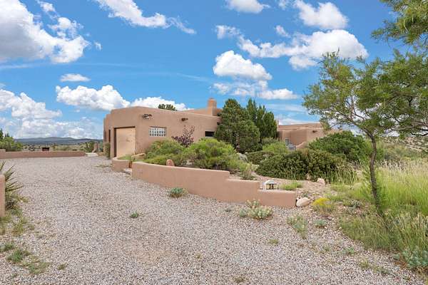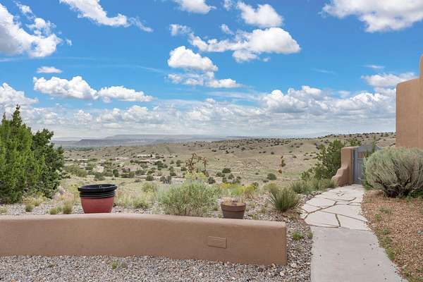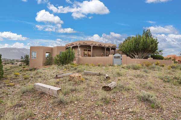 More Than a Home - It's a Lifestyle in Placitas, NM. This completely updated custom Southwestern retreat rests on over 6 private acres bordering Open Space and BLM land with panoramic views of four mountain ranges. The great room showcases soaring beamed ceilings, walls of windows, and a kiva fireplace. A chef's kitchen with granite counters, custom cabinetry, and walk-in pantry, separate living room with kiva fireplace and dining. The primary suite includes a spa-like bath, walk-in closets, and private covered patio. Four additional bedrooms, a guest bath, powder room, provide comfort and versatility. Outdoor living features multiple covered patios and space for a hot tub. A 3 car garage and owned solar PV Just minutes from I-25 and Albuquerque, this home offers unmatched privacy