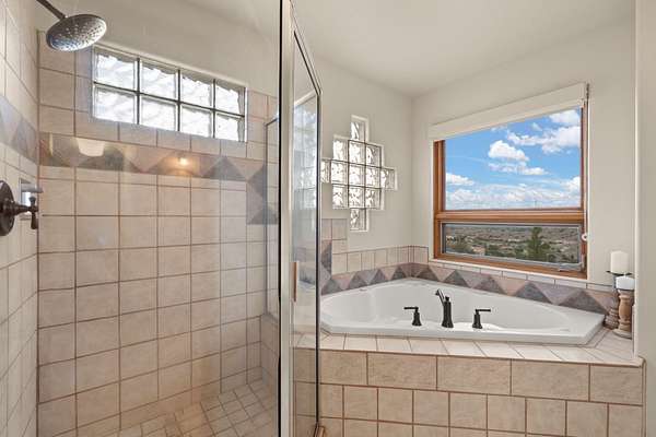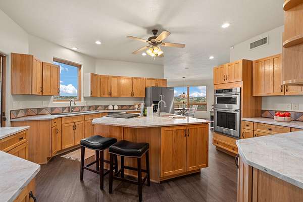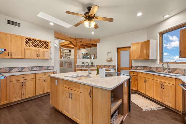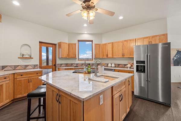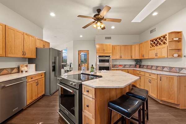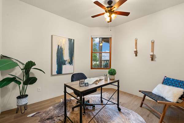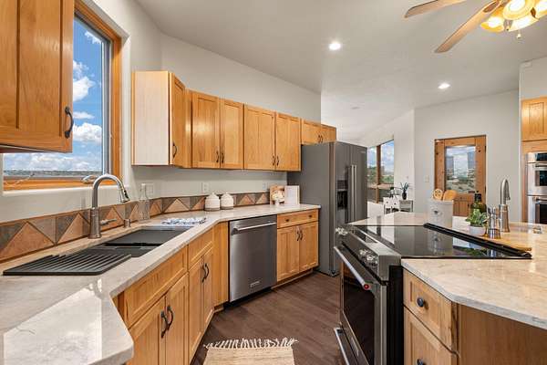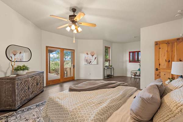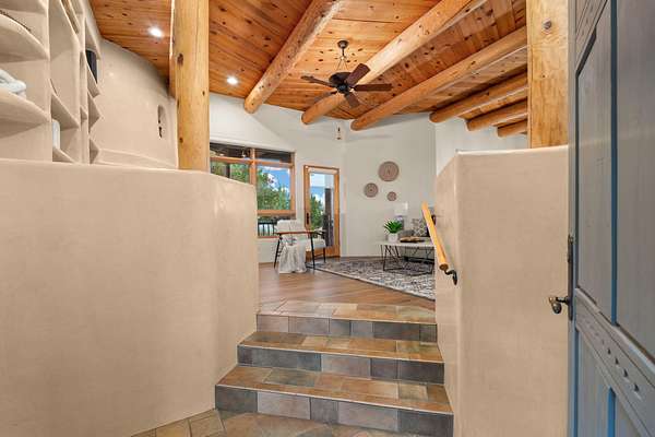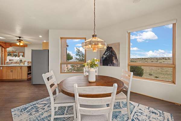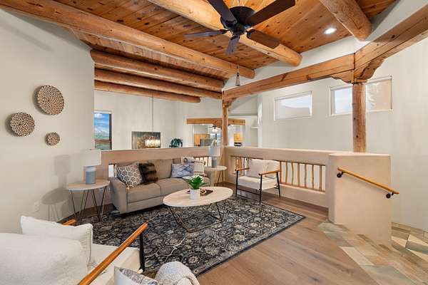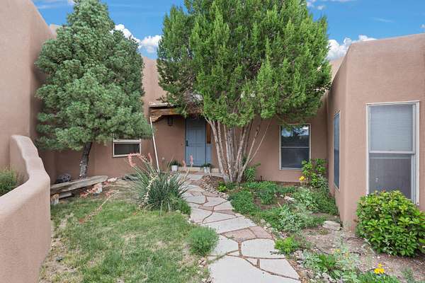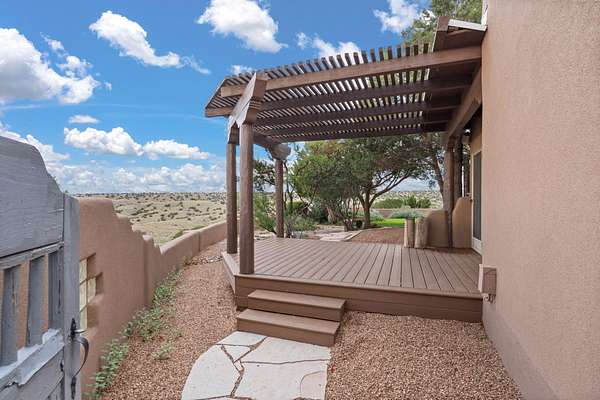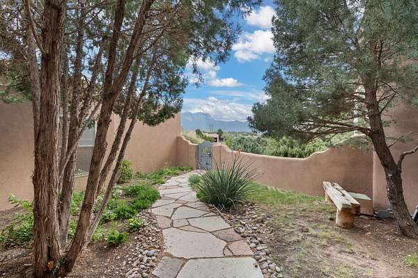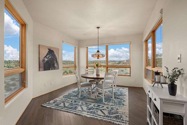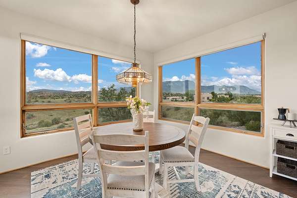 More Than a Home - It's a Lifestyle in Placitas, NM. This completely updated custom Southwestern retreat rests on over 6 private acres bordering Open Space and BLM land with panoramic views of four mountain ranges. The great room showcases soaring beamed ceilings, walls of windows, and a kiva fireplace. A chef's kitchen with granite counters, custom cabinetry, and walk-in pantry, separate living room with kiva fireplace and dining. The primary suite includes a spa-like bath, walk-in closets, and private covered patio. Four additional bedrooms, a guest bath, powder room, provide comfort and versatility. Outdoor living features multiple covered patios and space for a hot tub. A 3 car garage and owned solar PV Just minutes from I-25 and Albuquerque, this home offers unmatched privacy