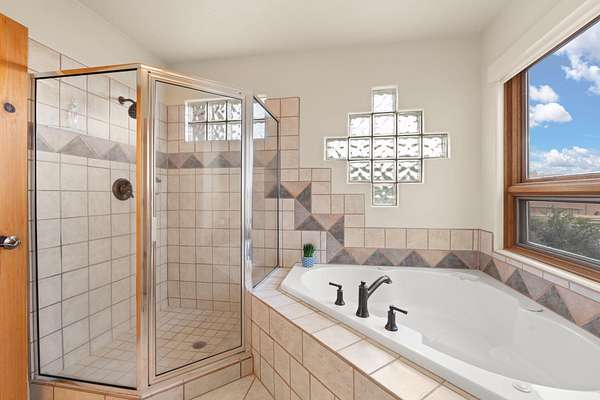 - Beamed Ceilings, Bookcases, Breakfast Area, Ceiling Fans, Central Vacuum, Dual Sinks, Family Dining Room, Great Room, Jetted Tub, Kitchen Island, Living Dining Room, Main Level Primary, Multiple Living Areas, Pantry, Separate Formal Dining Room, Separate Shower, Sitting Area In Master, Skylights, Walk In Closets, Water Closets