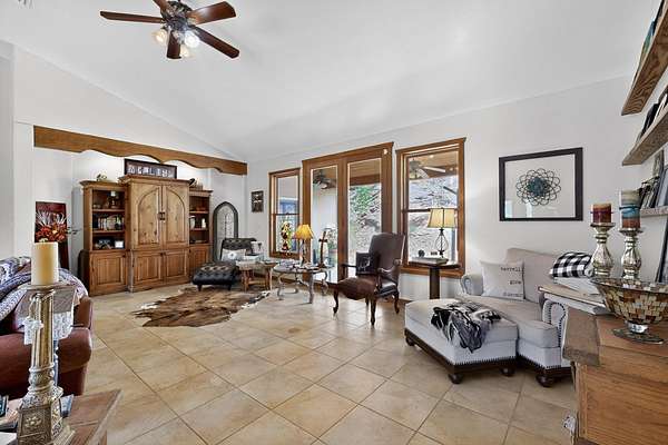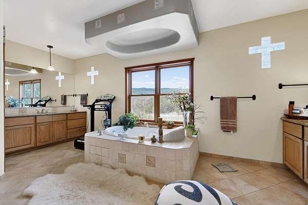 Experience luxury living in this stunning 4,200 sq ft home set on over 4 acres with breathtaking views of the Sandias. This light-filled residence features soaring ceilings, an open floorplan, and exceptional insulation for year-round comfort. The expansive kitchen boasts abundant storage, newer appliances, and an InstaHot system. The massive primary suite offers a spa-like en-suite with a steam shower. Enjoy peace of mind with a brand-new roof, a strong-producing well, and an owned 1,000-gallon buried propane tank. There is a large covered porch on both the front and back of the home for outdoor entertaining, a terrific workshop with lots of storage, and a horse stable--perfect for hobbyists and equestrians alike! All of this on a dead-end canyon road offering peace and privacy!
