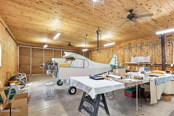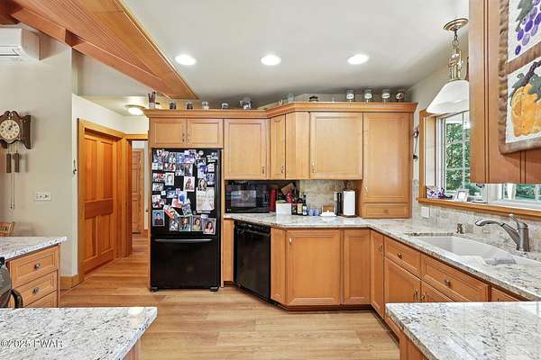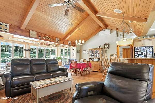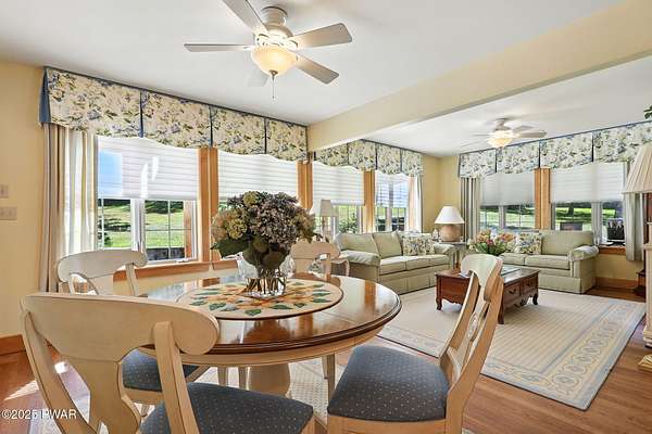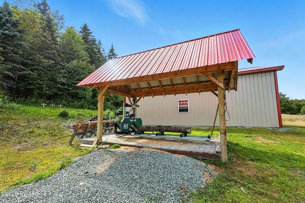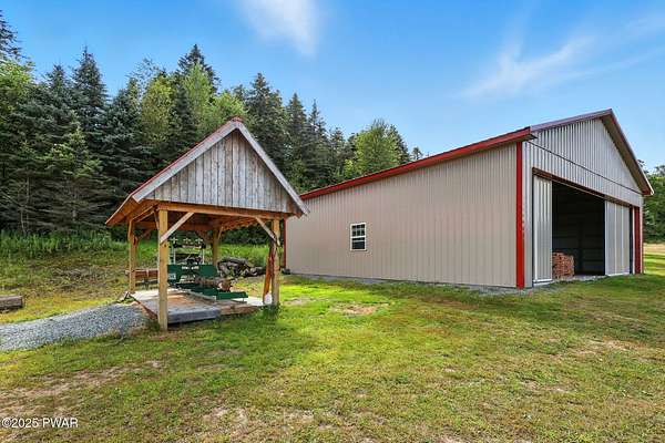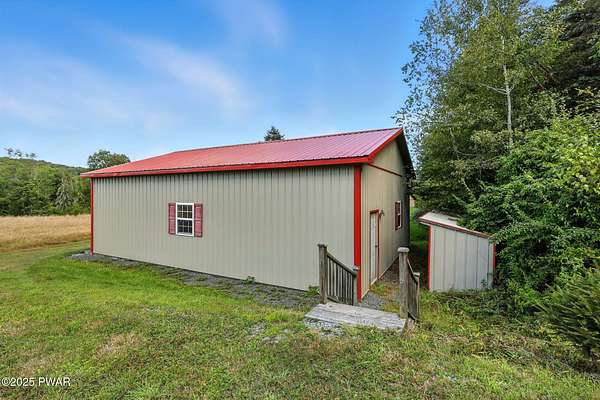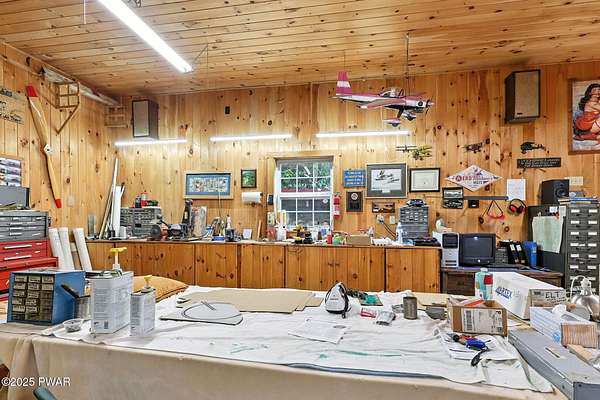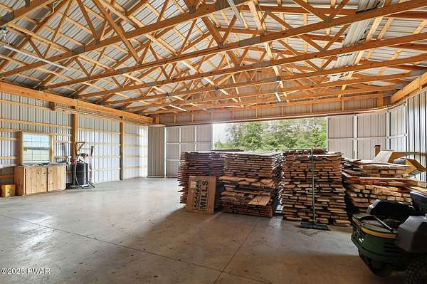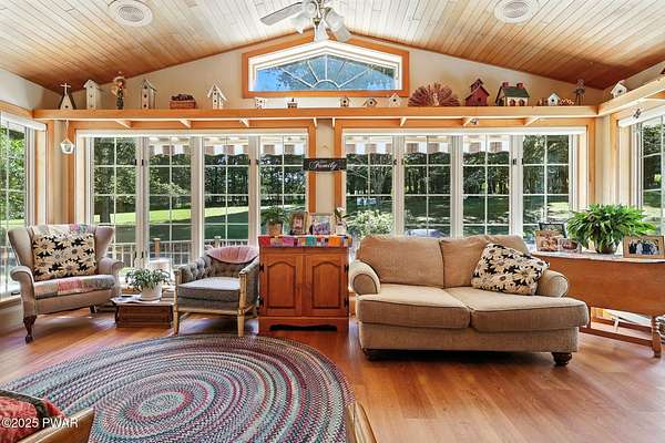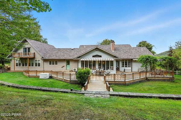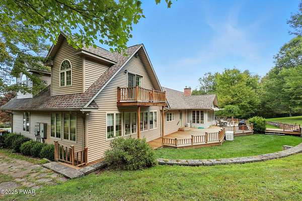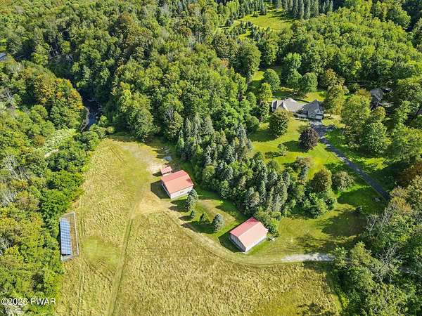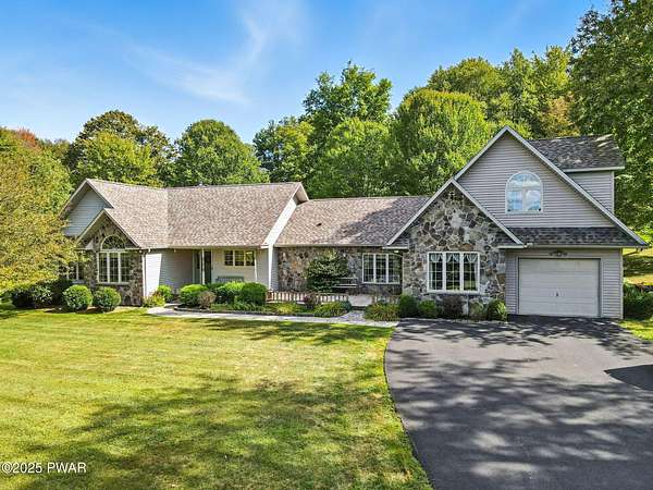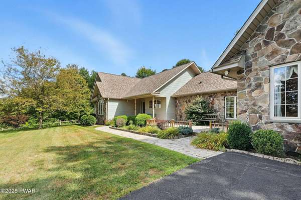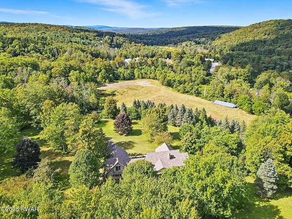 A one-of-a-kind 67-acre private country estate just 15 minutes to Honesdale and 25 minutes to Elk Mountain, this remarkable property features 6 bedrooms, 4 bathrooms, multiple living areas, and exceptional outbuildings, all surrounded by breathtaking scenery. The paved quarter-mile driveway winds through rolling fields, fruit trees, and miles of historic stone walls, leading to a striking stone-and-vinyl residence carefully maintained by the same family for years. Step inside to bright living spaces filled with natural light and countryside views. A brick wood-burning fireplace anchors the expansive main living area, where the open kitchen, dining room, and sunroom connect seamlessly. The kitchen offers granite countertops and quality cabinetry, while the sunroom's walls of windows frame the serene landscape. The main-level primary suite is a retreat with vaulted ceiling, spa-like bath featuring a jacuzzi tub with views, walk-in shower, and spacious walk-in closet. Two additional bedrooms, a tiled full bath, and convenient laundry complete this wing. The finished lower level impresses with a sprawling family room accented by stonework and a bar, built-in cabinetry, an office/craft room with refrigerator, abundant storage, and a workshop. A highlight of this estate is the separate living quarters, with its own entrance, primary suite, full bath, office, generous living/dining area with kitchenette, plus two more bedrooms and another full bath upstairs--perfect for extended family, guests, or an in-law setup. Outdoors, relax on the expansive deck and porch while overlooking rolling acreage, miles of stone walls, and extensive stream frontage for fishing, swimming, and recreation. Outbuildings include a 30x40 insulated workshop with wood burner, a 40x40 storage barn, and a detached stone-front garage with stove and workspace. This extraordinary property offers unmatched privacy, beauty, and timeless character--an estate of this scale and setting is truly rare.