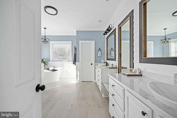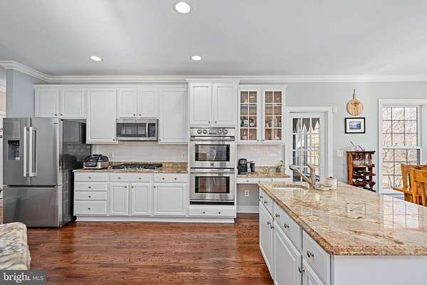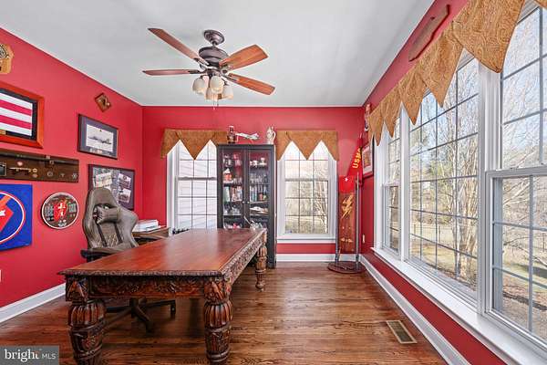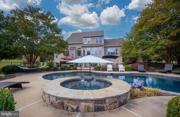 Welcome to 36 Windsong Way, an impressive French-style estate in the exclusive Hunters Pond community of North Stafford. Set on 5.45 acres with private pond frontage, this 6-bedroom, 4.5-bath residence offers more than 6,600 sq ft of finely finished living space across three levels, blending craftsmanship, scale, and resort-inspired amenities. The main level showcases hardwood flooring, elegant crown molding and chair rail, and abundant natural light throughout the foyer, living, dining, office, and family rooms. The formal dining room provides an inviting setting for entertaining, while the office features a bay window, shadow-box trim, and detailed millwork. At the heart of the home, the family room rises to a cathedral ceiling and centers around a stone-to-ceiling gas fireplace with mantle and arched windows overlooking the backyard and pond. The kitchen is both stylish and functional, offering granite countertops, crisp cabinetry, tile flooring, island + table space, pantry, and a full suite of stainless-steel appliances. A tiled half bath and convenient laundry area sit nearby. The main-level primary suite delivers a private retreat with cathedral ceiling, hardwood floors, ceiling fan/light, walk-in closet + double-door closet, and a luxurious ensuite bath featuring tile flooring, soaking tub, stand-alone shower with dual heads and four side sprays, electronic temperature controls, dual vanity and heated floor and towel rack for chilly mornings. Upstairs, four additional bedrooms feature hardwood floors, ceiling fans, and generous closets. Two share a Jack-and-Jill bath with dual vanity and tub/shower combo, while a third full bath offers a dual vanity and tiled walk-in shower. The fully finished walk-up lower level extends the home's versatility with a recreation room, media room, and kitchenette complete with stainless appliances, granite counters, and oak cabinetry. A to-code bedroom and full bath provide flexibility for guests or multi-generational living. Outside, enjoy a private oasis built for entertaining-featuring a heated in-ground pool, hot tub, stamped-concrete patio, storage shed, and dock to the private pond with fountain. The 3-car side-entry garage, vinyl fencing, mature trees, and landscaped grounds complete this serene setting. Luxury, privacy, and everyday comfort converge at 36 Windsong Way-a rare Stafford County retreat offering resort-style living in a truly timeless setting.