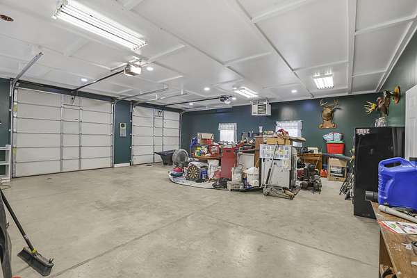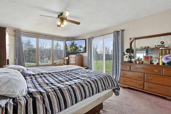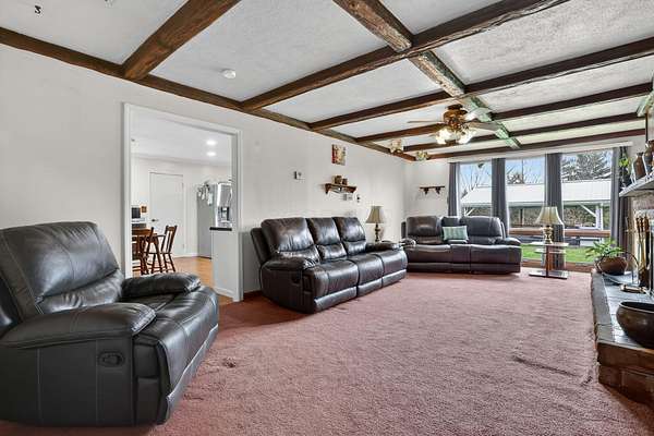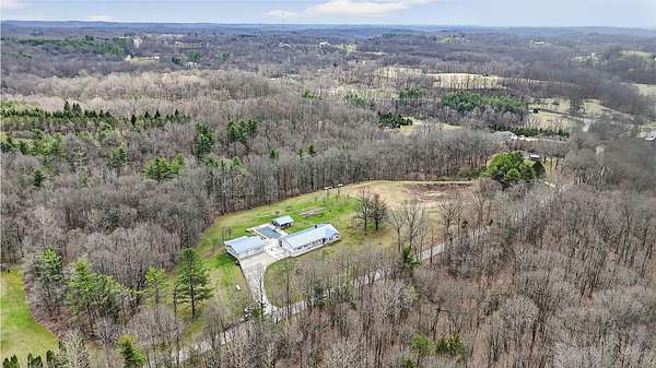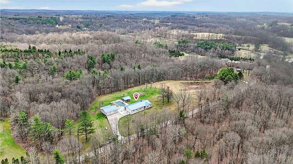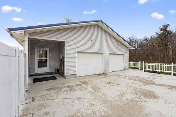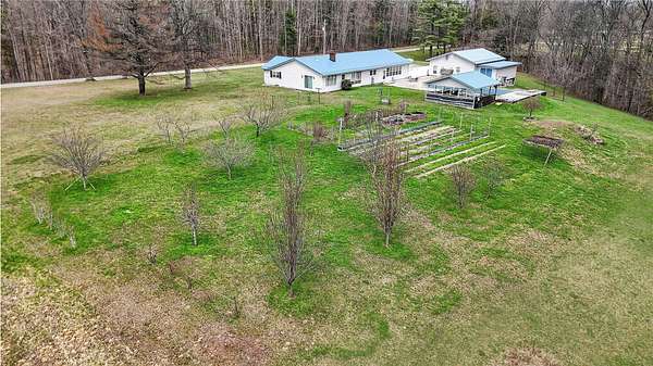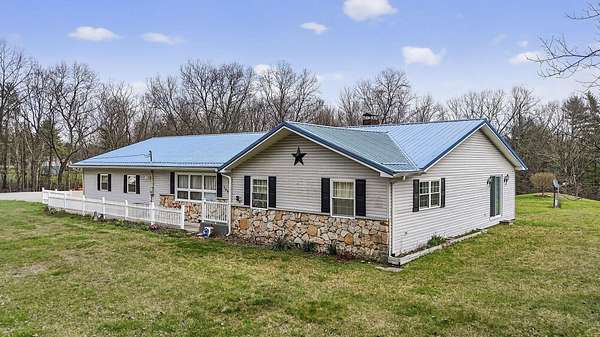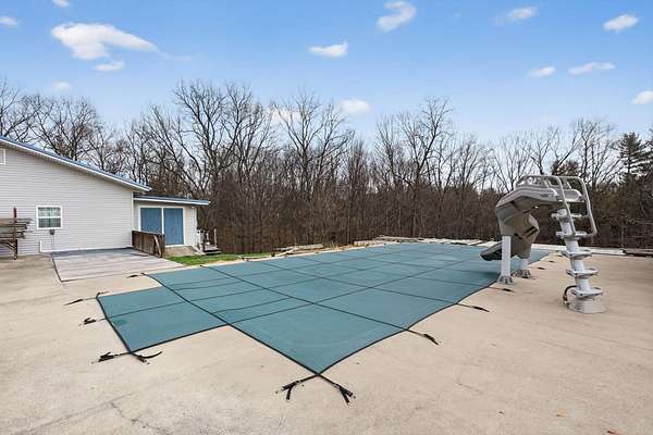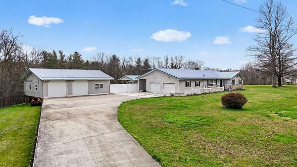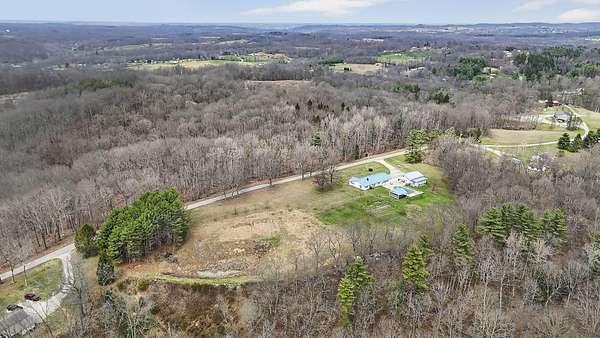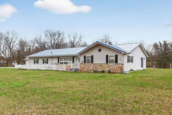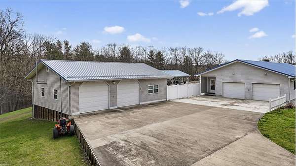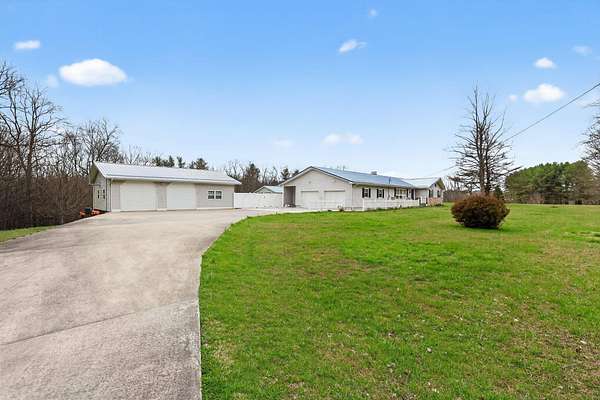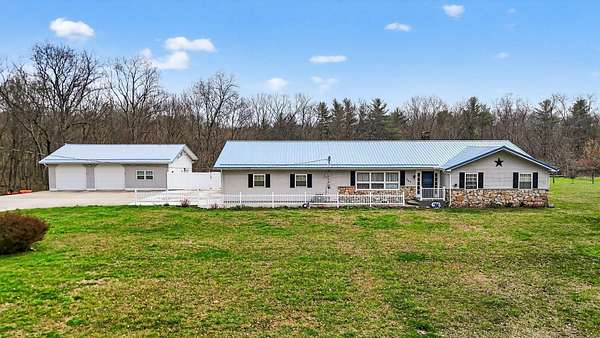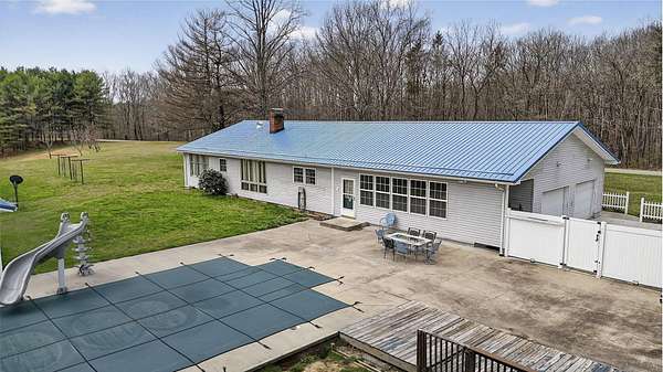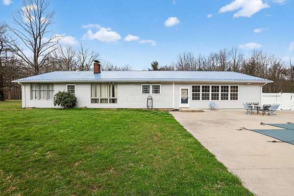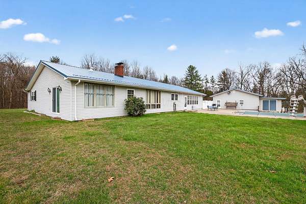 Experience the perfect blend of privacy, comfort, and outdoor enjoyment in this spectacular country retreat set on 5.3 scenic acres with breathtaking rural views in every direction. Designed with entertaining in mind, this expansive 3-bedroom, 2-bath ranch offers generous living spaces, including a large foyer area, a large eat-in kitchen with stainless steel appliances, a spacious dining room, and a welcoming living room featuring a cozy wood-burning fireplace with wood ceiling beams. The main suite is a true retreat with sliding glass doors, a walk-in closet, and a private en-suite bath, while the oversized main bathroom adds to the home's thoughtful layout. Step outside to your own private oasis complete with an 18'x36' in-ground pool with slide and surrounding concrete deck, a 24'x24' shelter house perfect for gatherings, a 24'x36' detached two-car garage with extra-tall ceilings, electric, heat, and water, plus a 10'x32' workshop for hobbies or storage. A two-car attached side-entry garage and concrete driveway provide added convenience. The home's exterior shines with a stone accent wall, composite front porch with vinyl railing, and numerous updates including a metal roof with ice guards, vinyl siding, vinyl windows, and gutters with leaf guards--all approximately five years old. The beautifully maintained acreage features a private fruit cellar, a variety of fruit trees, nut trees, and berry bushes, creating a serene and self-sustaining country lifestyle that's as functional as it is picturesque.