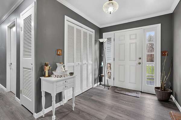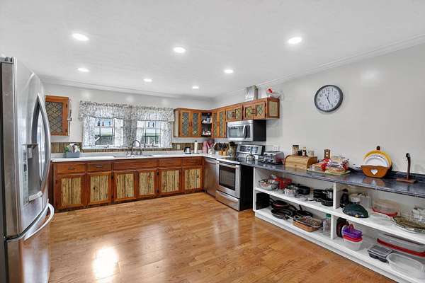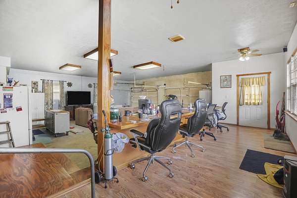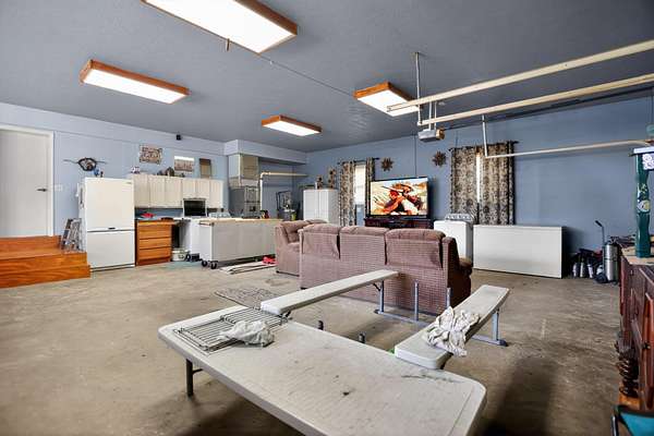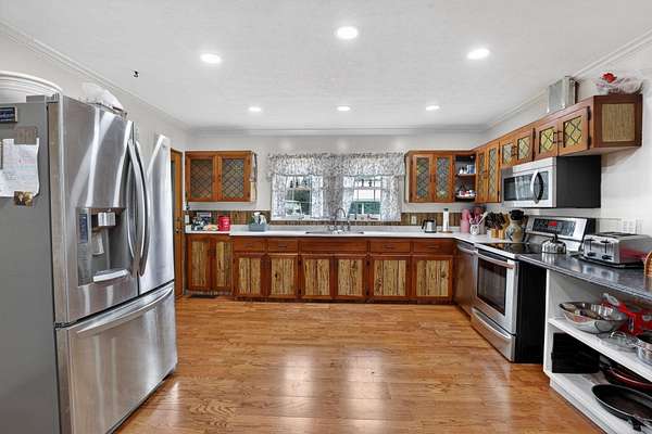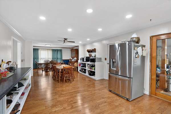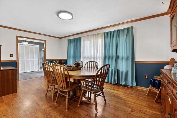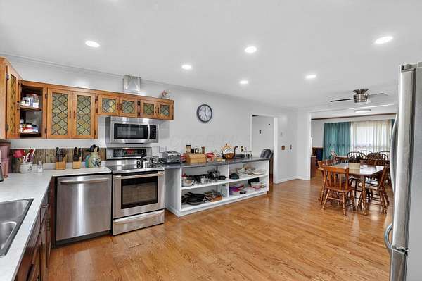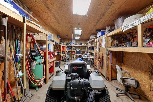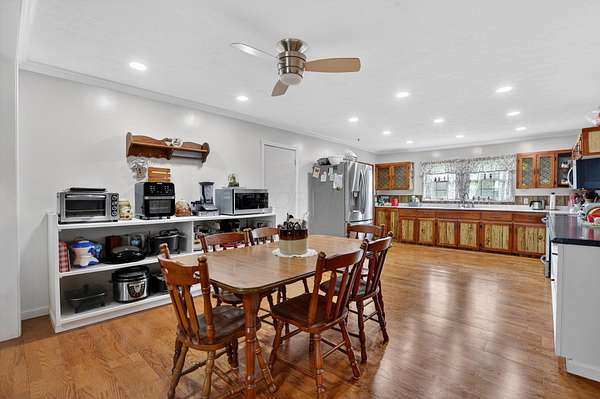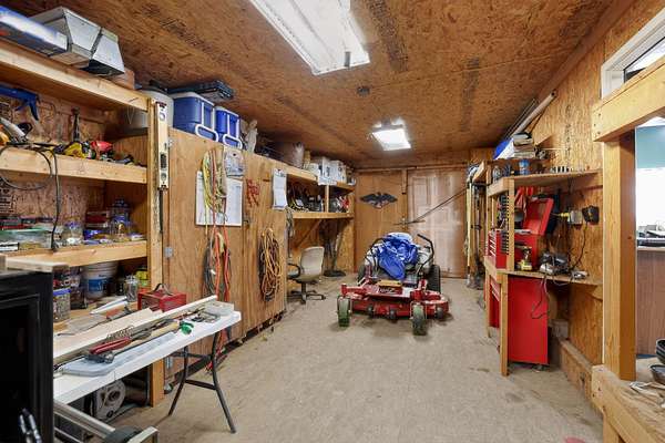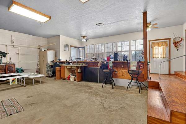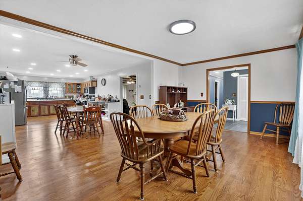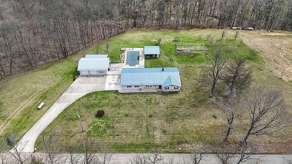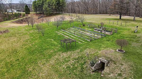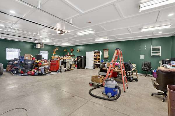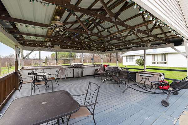 Experience the perfect blend of privacy, comfort, and outdoor enjoyment in this spectacular country retreat set on 5.3 scenic acres with breathtaking rural views in every direction. Designed with entertaining in mind, this expansive 3-bedroom, 2-bath ranch offers generous living spaces, including a large foyer area, a large eat-in kitchen with stainless steel appliances, a spacious dining room, and a welcoming living room featuring a cozy wood-burning fireplace with wood ceiling beams. The main suite is a true retreat with sliding glass doors, a walk-in closet, and a private en-suite bath, while the oversized main bathroom adds to the home's thoughtful layout. Step outside to your own private oasis complete with an 18'x36' in-ground pool with slide and surrounding concrete deck, a 24'x24' shelter house perfect for gatherings, a 24'x36' detached two-car garage with extra-tall ceilings, electric, heat, and water, plus a 10'x32' workshop for hobbies or storage. A two-car attached side-entry garage and concrete driveway provide added convenience. The home's exterior shines with a stone accent wall, composite front porch with vinyl railing, and numerous updates including a metal roof with ice guards, vinyl siding, vinyl windows, and gutters with leaf guards--all approximately five years old. The beautifully maintained acreage features a private fruit cellar, a variety of fruit trees, nut trees, and berry bushes, creating a serene and self-sustaining country lifestyle that's as functional as it is picturesque.