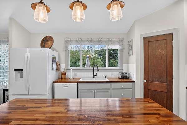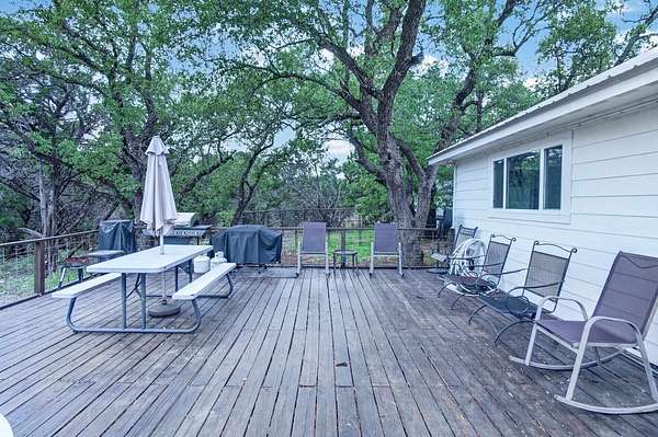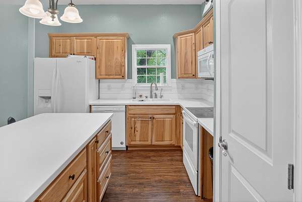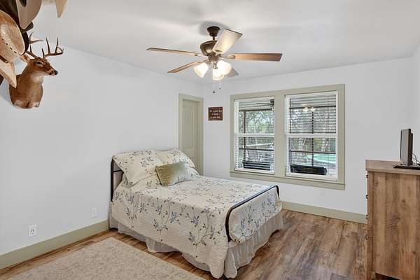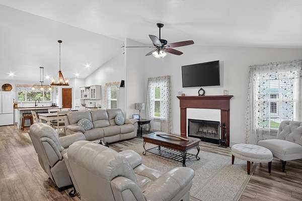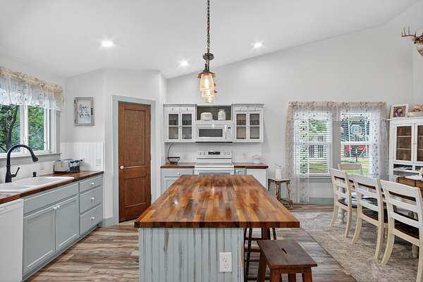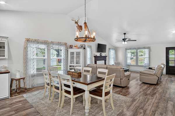 Welcome to your private retreat on 5 wooded acres - where space, comfort and versatility come together beautifully. This charming 1,816 sq ft home features 3 bedrooms and 2 baths. Beautiful durable Pergo floors run throughout the home. The thoughtfully planned open-concept layout with vaulted ceilings creates a bright, airy living space perfect for both relaxing and entertaining. Kitchen is designed with classic white appliances, warm butcher block countertops, and plenty of workspace for everyday living. The living space opens up to a screened in back porch that leads to a large deck and above ground pool-giving you your own backyard oasis. Both front and back porches invite peaceful views of the surrounding property. This property also includes a fully functional 900 sq ft guest house featuring 2 beds, 1.5 baths, a full kitchen, walk-in closets and laundry hookups-perfect for extended family, guests, or rental income potential. Additional improvements on the property include a 510 sq ft finished building ideal for home office, studio, or game room; 36x36 metal RV/carport with an attached 12x16 storage shed; 20x25 metal shop with electricity. With room to spread out, multiple living spaces, and endless possibilities, this unique property offers the perfect blend of country living and modern convenience.