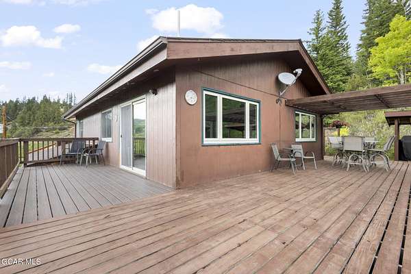 This spacious, 4-bedroom home offers breathtaking views and scenery situated on 10.74acres. Featuring a beautiful mix of willows, wildflowers, aspen, spruce trees, pasture and a lovely creek. Enjoy ample parking with a single-stall lean-to and tons of open parking, along with numerous outbuildings and sheds for all your storage needs. Inside, you'll find an updated kitchen and flooring, along with large windows that let in natural light and showcase the stunning scenery. Stay cozy with a pellet stove and wood stove on chilly days. The master bedroom features wood flooring and a walk-in, cedar-lined closet. Step outside to a lovely gazebo off the expansive decking, perfect for outdoor entertaining, with a sliding glass door from the kitchen for alfresco dining on the composite deck. The property also boasts a beautiful lawn and garden area, all within close proximity to public lands and multiple reservoirs for endless outdoor adventures. Don't miss this incredible opportunity to enjoy country living at its finest!