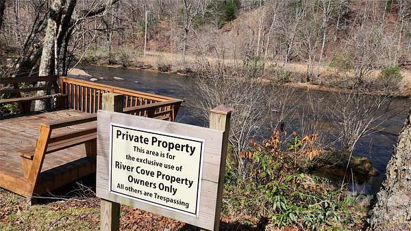 From intersection of Hwy 64 West and Hwy 69 in Hayesville drive west about five miles to a right on Lance Cove Rd (SR 1303). Follow Lance Cove Road to the river bearing right at the river. Lance Cove Road runs into Sweetwater Bend Loop. Continue along the river to a right at River Cove entrance. Go up the hill to a sharp right to driveway on the right. Access road starts out as state maintained paved road to state maintained gravel road to private road. Near the entrance to the subdivision the road parallels the large Hiwassee River before road turns up the hill into River Cove.
