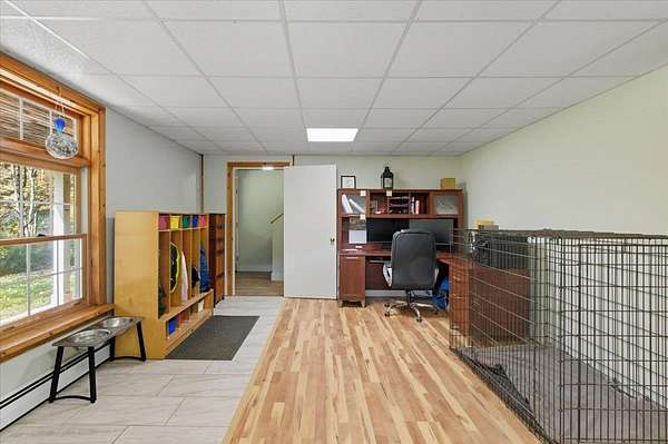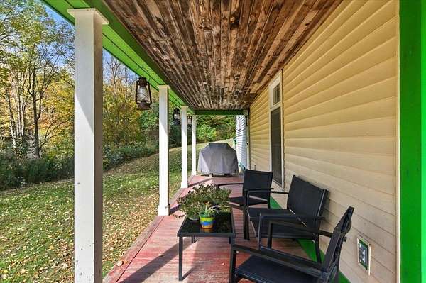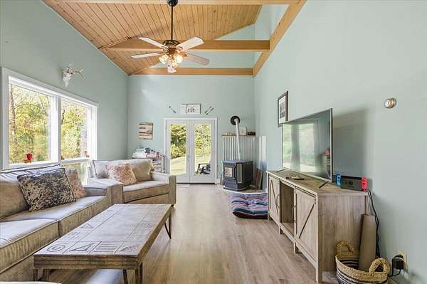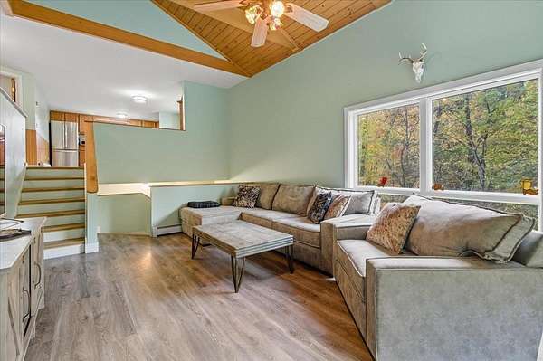 Nestled on over 12 private acres in Moretown, this property offers the perfect balance of seclusion and convenience! Just 10 minutes to downtown Montpelier and I-89, yet tucked away on a quiet back road. Surrounded by wooded hillsides with trails throughout, it's an outdoor lover's dream. Inside, the great room impresses with soaring vaulted ceilings, exposed beams, and abundant natural light filling the space, while a pellet stove adds cozy warmth during the winter months. A glass door opens to the deck, extending your living space into the peaceful outdoors. The open kitchen and dining area flow easily into the main living space, ideal for everyday living and entertaining while brand new flooring stretches throughout the home. Two spacious bedrooms with large double closets and a full bath with laundry complete the main level of this open concept floor plan. The partially finished lower level provides a welcoming mudroom and foyer, doubling as a perfect flex space, while the unfinished portion offers room for a workshop or potential for future expansion! Enjoy your morning coffee on the covered front porch as wildlife passes by, or set out on your own private trails through the acres of woodlands behind the home. Offering a rare combination of tranquility and convenience in a spectacular location, this home awaits new owners... Schedule your showing today!