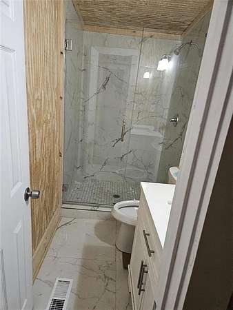The bright master suite showcases a cathedral ceiling, walk-in closet, and a completely renovated master bath with a double vanity, new mirrors, stylish tile flooring, and a beautifully tiled shower surround.