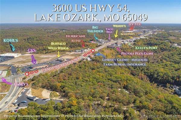 As the Lake continues to grow, don't miss the opportunity to grow with it as this is one of the most traveled areas at the Lake of the Ozarks! Well over 10,000 vehicles travel Old HWY 54 every day! This Commercial Building sits in a prime location on Osage Beach Parkway and features 2625 sqft, a billboard and 46 Acres of land. The possibilities are endless with 917 feet of road frontage, there is plenty of room to build a hotel, shopping center, apartments, restaurants, or any other commercial structure. This wonderful location is close to the new casino being built, Buffalo Wild Wings, CVS, Aldi, Menards, Kohls, Taco Bell, Wendy's and so much more. Some of the highest traffic counts in the area, PLUS roadside exposure from two lane traffic. . . You won't find a better location to build or relocate your business than this!