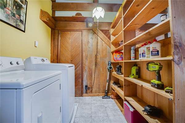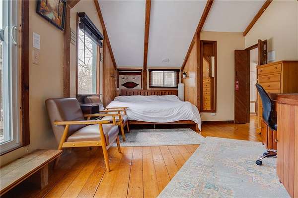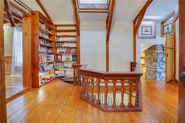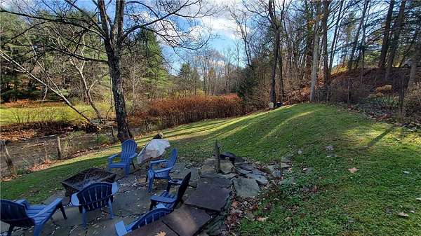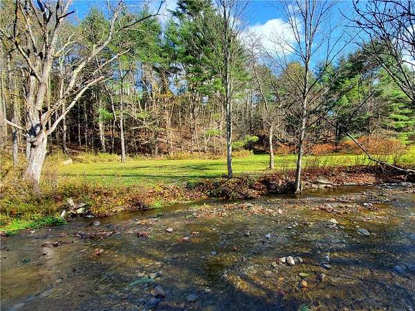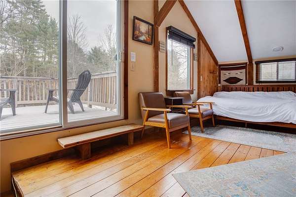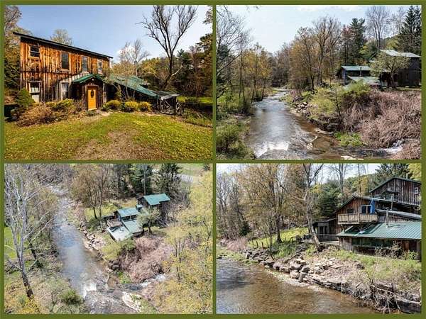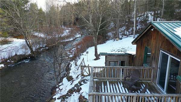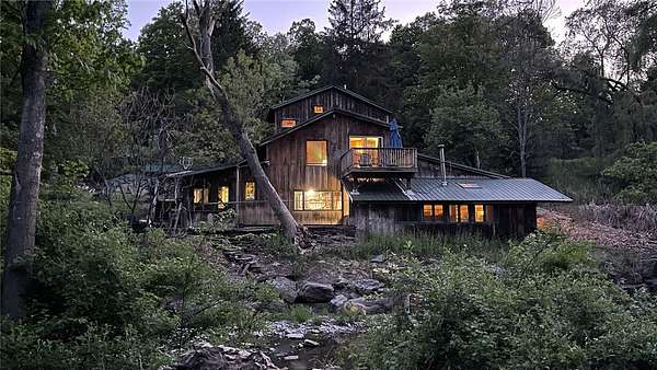 This contemporary retreat, located just minutes to Oneonta, is a proven income generator through the local short term rental market, that offers a combination of unique layout, desirable features, and stylish flourishes. The house itself is nearly 2600 square feet in size, and covers three distinct living levels. Entering the home presents a regal and warm semi-formal living room space. A stairway leads up to the spacious top level primary suite, with plentiful room for a workspace, walk-in closet, and en-suite full bath with clawfoot tub. Back on the main level, a central landing opens into a full bathroom with tiled tub surround and connected sauna. This bathroom also connects to the second bedroom, a spacious room with a desk, sitting area, and slider doors out to a balcony overlooking the year-round creek. Continuing downstairs to the lower level, the charming informal living room showcases an enormous fieldstone fireplace surround and exposed beam ceilings. A few charming sitting/sleeping nooks, a second woodstove, a bonus workout and gameroom, and laundry-utility room all flank the central kitchen area. The picture windows with lengthy counter space for eating and reading look out over a tidy patio and bench overlooking the stream. The home is just quirky and cool, with stained glass features, nooks galore, and exposed wood for a real rustic feel. Outside the home, the land has a lengthy road frontage with the prominent Harrison Creek running just below and flowing along the length of the lot. A fenced yard with secondary patio and barbeque area has stone steps directly down to the water, beckoning you to cross through the low water and explore the open meadow, fire pit, and nature trail. This home could make for a primary residence with great access to Oneonta, and regional employment. It has been used as a second home/investment property hybrid, with the calendar completely booked for summer '26 already! With furnishings included, this stylish home, located literally 4 minutes from Cooperstown All Star Village and 25 minutes to Dreams Park, presents something for everybody in an incredibly unique package.