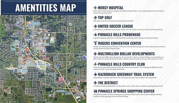 The property is ideally situated directly off Interstate 49, providing excellent visibility and accessibility. Its location is further enhanced by its proximity to the rapidly developing Pinnacle area of Rogers. This area is witnessing an exciting phase of growth with several high-profile developments enhancing its appeal and utility. Notably, the Pinnacle Hills area is set to see significant advancements including the addition of the Pinnacle Heights mixed-use development featuring upscale residential units and retail spaces, and the continued expansion of the Pinnacle Hills Promenade.