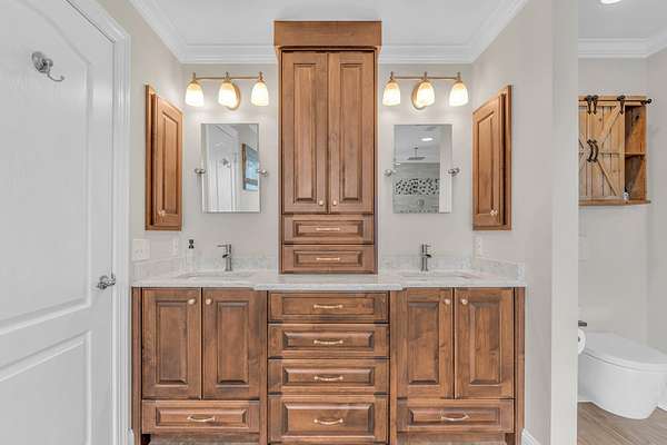 - Built-In Features, Ceiling Fan(s), Central Vacuum, Chandelier, Crown Molding, Double Vanity, En Suite, Entrance Foyer, Granite Counters, High Ceilings, High Speed Internet, Kitchen Island, Low Flow Plumbing Fixtures, Natural Woodwork, Pantry, Recessed Lighting, Separate Dining Room, Vaulted Ceiling(s), Walk-In Closet(s), Whirlpool Tub