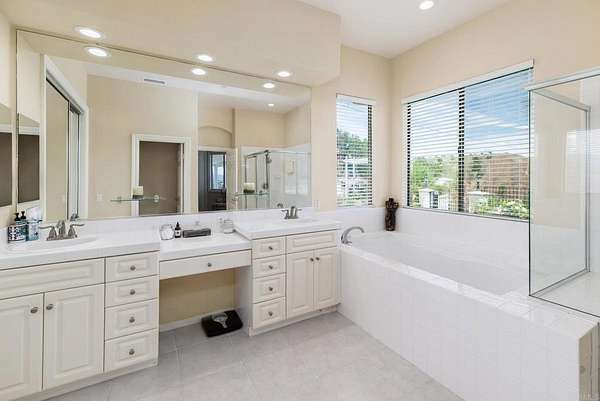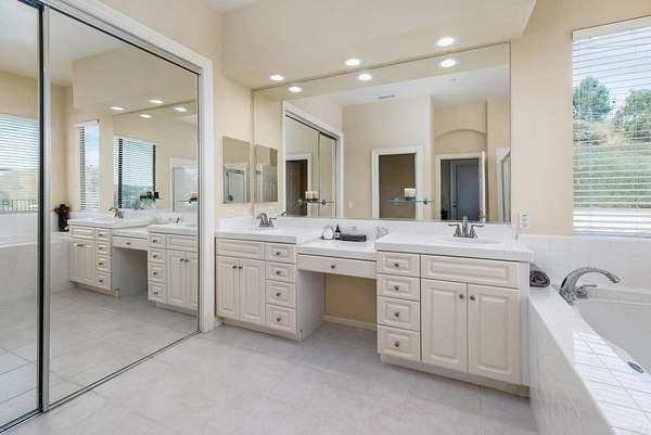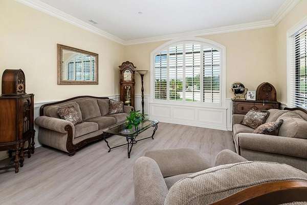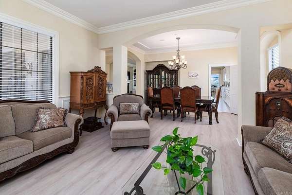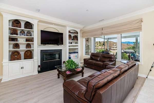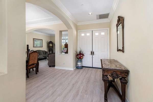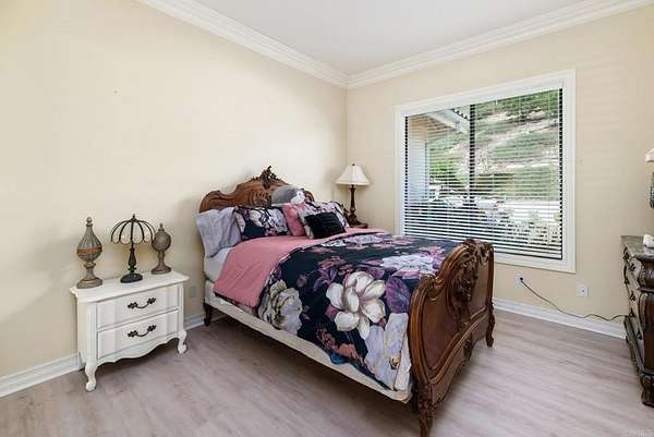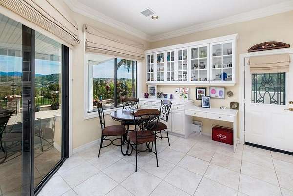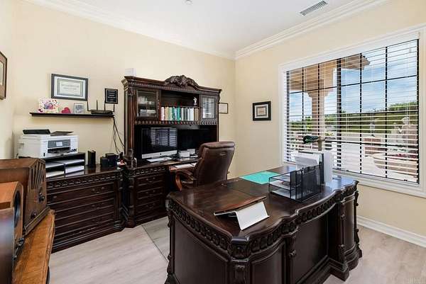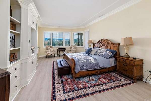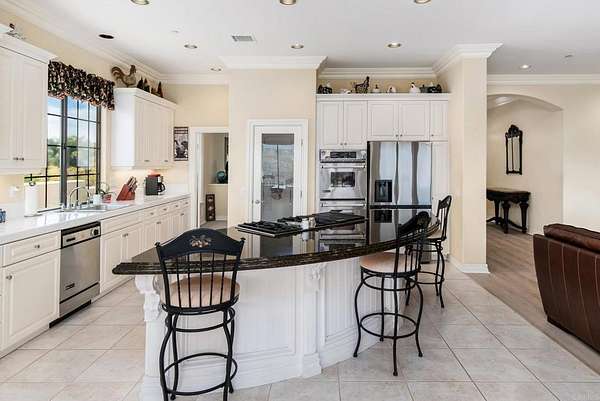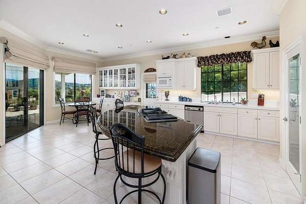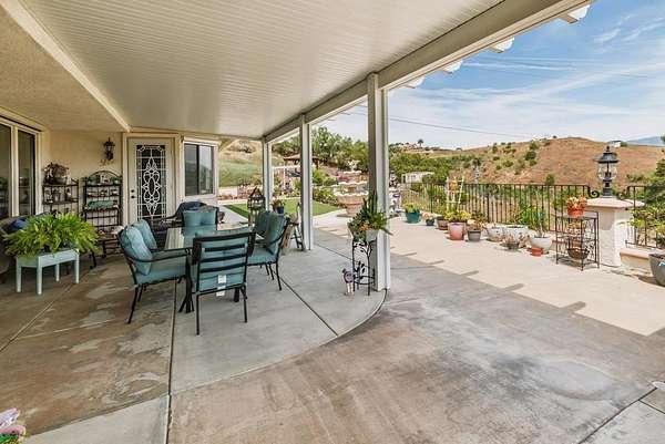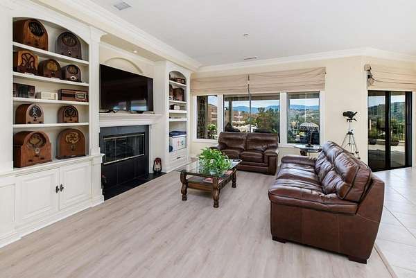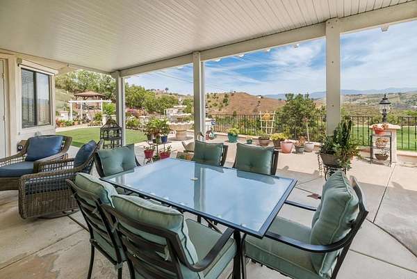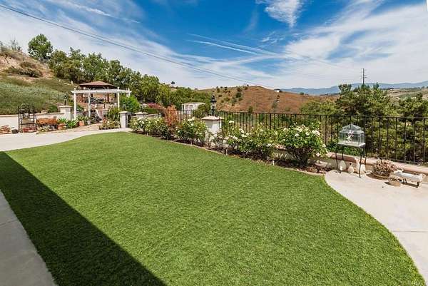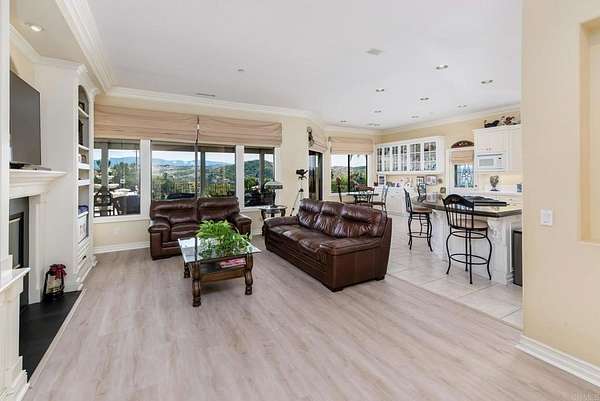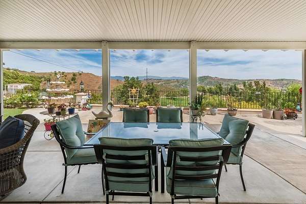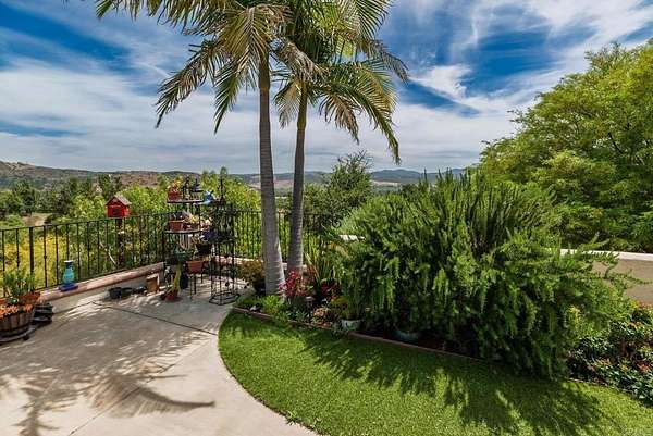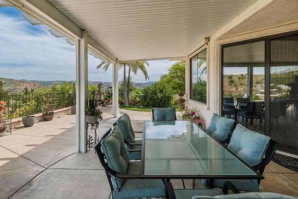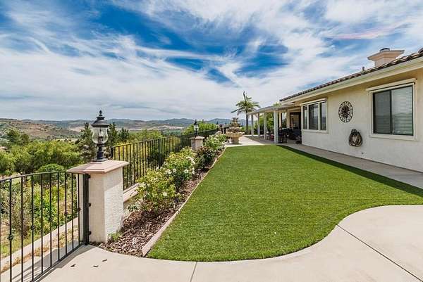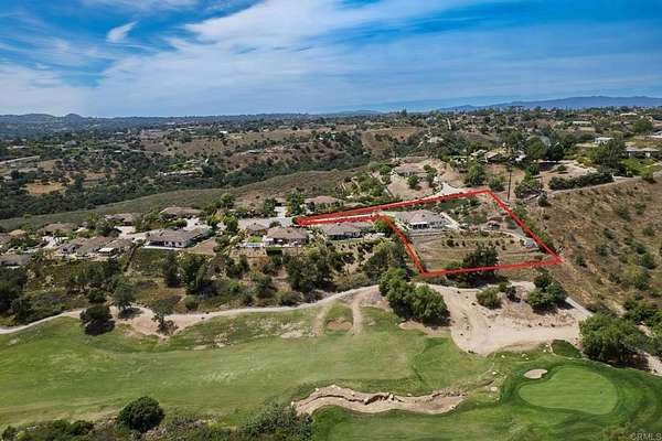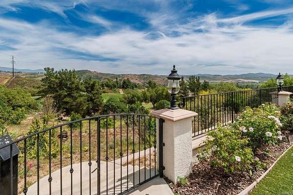 Beautifully maintained 4-bedroom, 2.5-bath, 2,810 SF, Single story home ideally positioned on 1.59 acres above the 6th green of the Golf Club of California, offering stunning views of the golf course, surrounding hills, mountains, and valley. This thoughtfully designed home features 10-foot ceilings, wide crown molding, and elegant wainscoting, creating a refined yet comfortable living environment. Newer roof underlayment and tile reset in 2023. Unlike many Fallbrook homes that are on septic and use propane, this home is connected to sewer and SDGE utilities. The spacious kitchen is equipped with a custom black granite island, recently refaced cabinetry, a decorative glass pantry door, and premium Jenn-Air appliances including a cooktop, double oven, and microwave. A cozy breakfast area overlooks the golf course, while the adjacent dining space accommodates a large table perfect for entertaining. The living room showcases a fireplace upgraded with gas logs and glass doors, while new vinyl plank flooring flows throughout the main living areas, complemented by tile in the kitchen, bathrooms, and laundry room. The generous primary suite offers a private retreat with space for a sitting area, custom built-in cabinetry, and direct access to the backyard patio. The en-suite bath includes a soaking tub, glass-enclosed shower, dual sinks, and a spacious mirrored closet. Stay cool with the newer 11/23 central AC and heat. Outdoor features include a flat, usable area around the home with additional terraced land ideal for gardening, fruit trees, or future expansion such as a pool or casita. The backyard is enhanced with wrought iron railings, masonry accents, carriage lighting, and multiple gated access points. The property is not fully fenced. A 10x12 storage shed provides additional functionality. Additional highlights include an attached 3-car garage, expansive driveway for additional parking, interior laundry room with storage and utility sink, security screen doors, and three exterior security cameras. The long driveway is lined with irrigated landscaping, supported by dual sprinkler systems. Located in a desirable golf course community that is public with access to a clubhouse and on-site dining, this home offers a perfect blend of privacy, scenic beauty, and convenience.