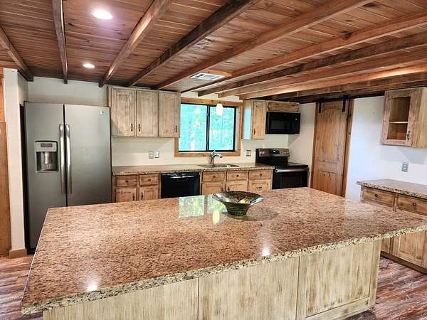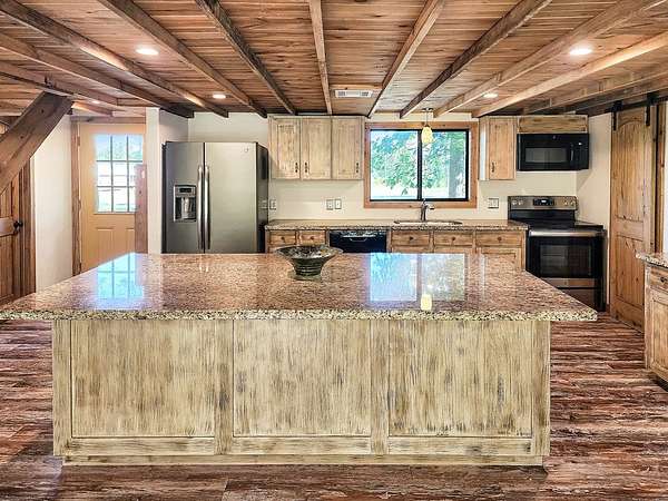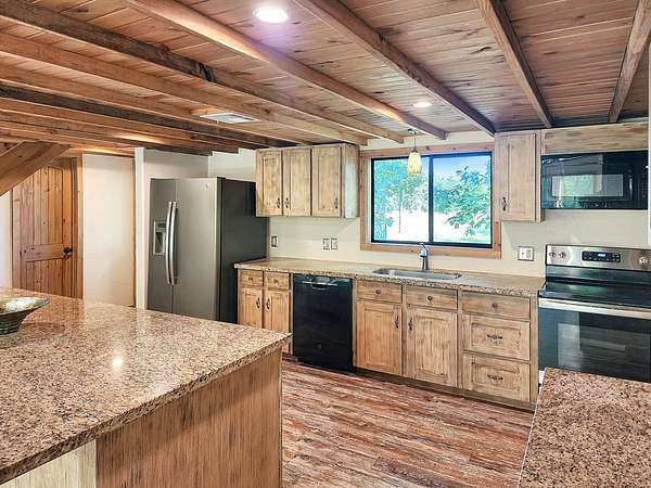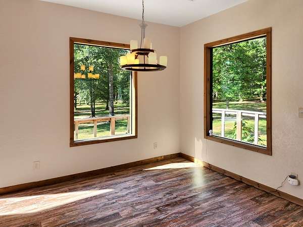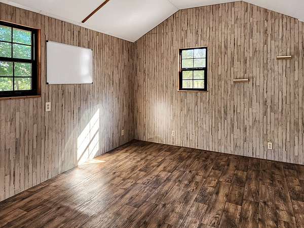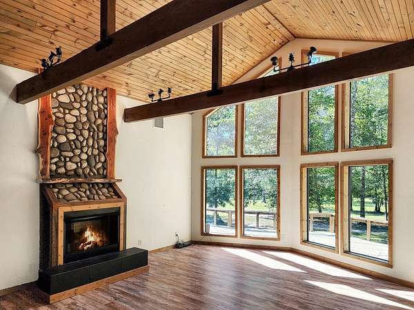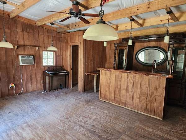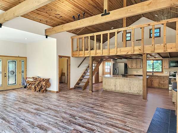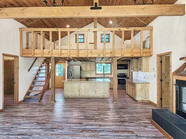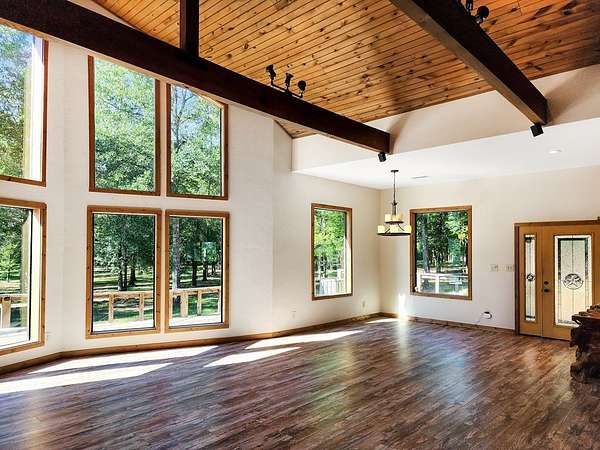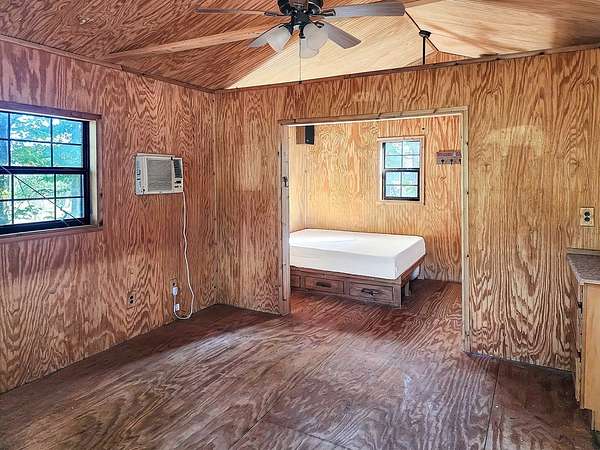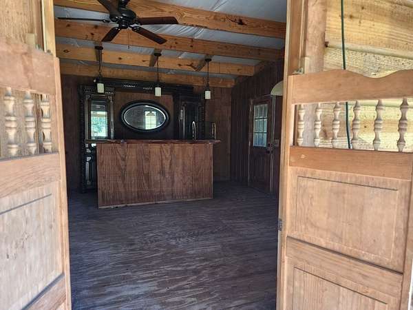 45.62 ACRES just 10 minutes from Jasper and 5 minutes to Newton—packed with personality and potential. The log-sided home features vaulted ceilings, large plate-glass windows, and a standout custom master shower. Downstairs offers 2 bedrooms and 2 bathrooms, plus an upstairs loft ideal for a third bedroom or flex space. Fiber optic internet is available for modern convenience. The property includes a stocked pond, two cabins, and two RV hookups—perfect for guests or rental income. A large storage building with apron adds function, while the real highlight is the saloon, complete with storage and workshop space. Gently rolling land suits livestock, expansion, or even an event venue. Great for a private retreat, income property, or entertaining.
