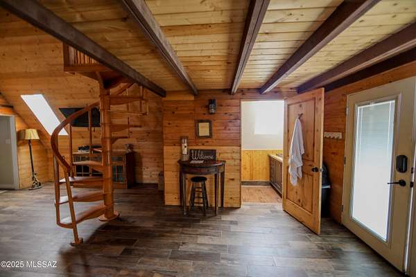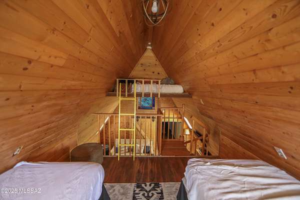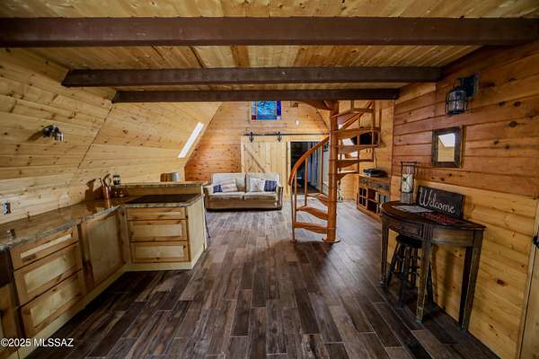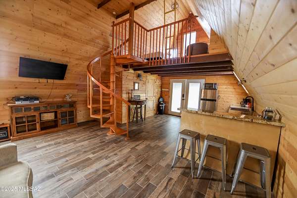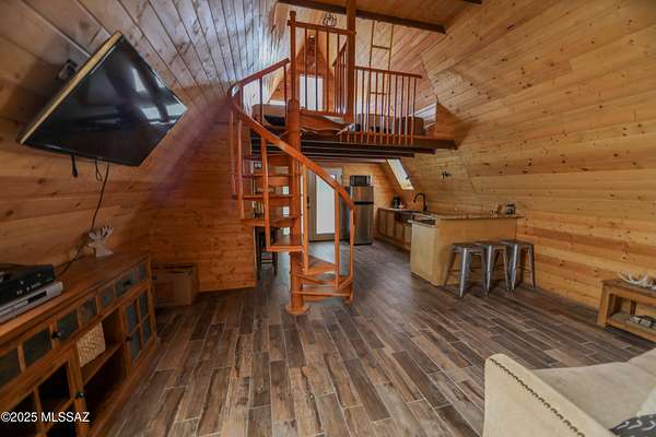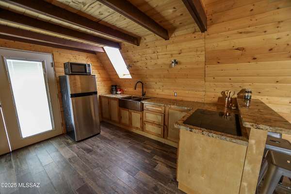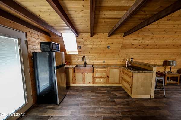 Perfect as a vacation home or peaceful country retreat in Southern Arizona, this beautifully remodeled 2BR/1BA A-frame offers charm and comfort in every detail. The spacious 23' x 17' kitchen features granite countertops, a hammered copper sink, and double doors that open to an inviting living room filled with natural light from three skylights. The bath includes a matching copper sink and skylight, while hummingbird stained glass and tongue-and-groove wood walls add rustic elegance. A barn door leads to the generous 20' x 14' primary bedroom. Relax on the deck and take in the sweeping views and tranquil surroundings. Seller to provide a credit for mini-splits at closing with an acceptable offer. Listing Agent holds a financial interest in the property.