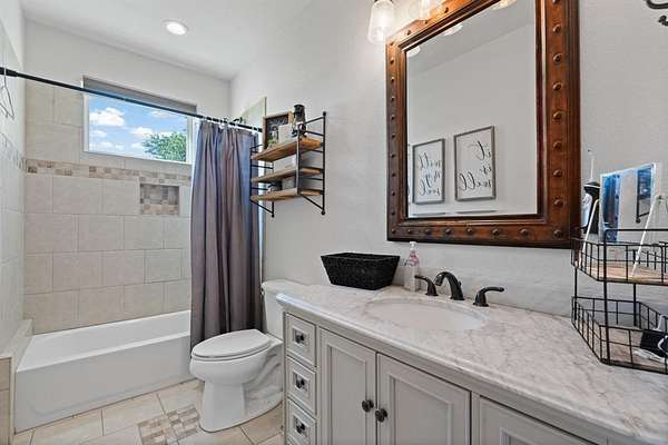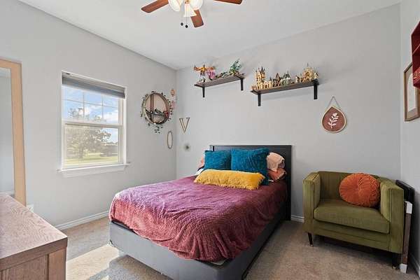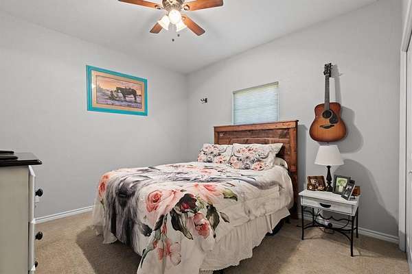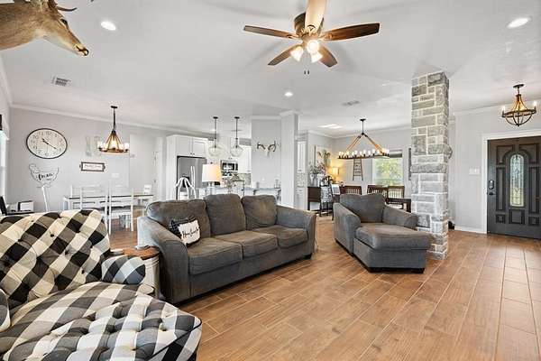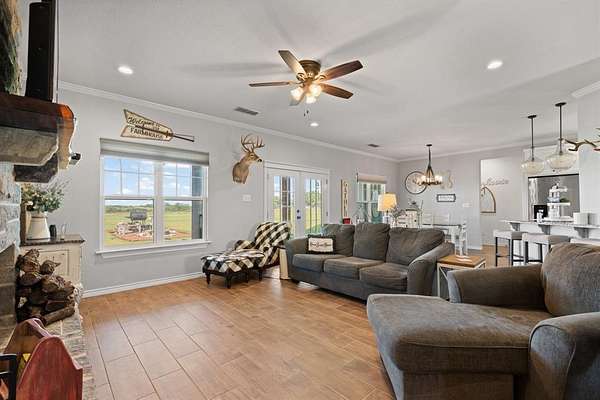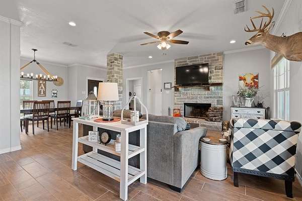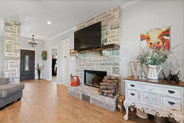 Gorgeous Move-In Ready Home on nearly 2 Acres! Come and Preview the Covered Patio on this 4 Bedroom or 3 Bedroom with Office (4th Bedroom being used as office), 2 Bathroom, 2 Car Garage with Oversized Driveway for Extra Parking. Picturesque Views from the Comfy Back Patio that has Decorative Tile Flooring. Living Room is surrounded by Windows so Glowing with Natural Warmth, Rustic Stone Fireplace is the Centerpiece of the Living Room. Formal Dining Room and a Cozy Kitchen Dining Area along with a Breakfast Bar. Stylish Wood-Look Tile carries through Every Room. You will love the Stylish Bathroom Vanities. Wake up and Walk out--Patio Access from the Primary Suite. And this Suite is so Spacious!