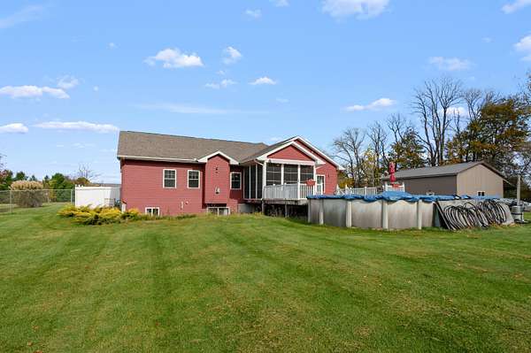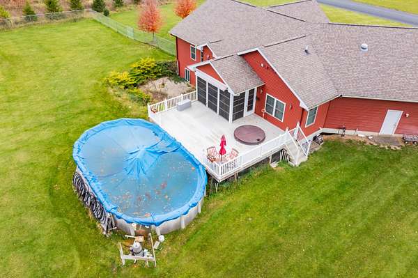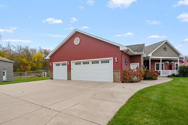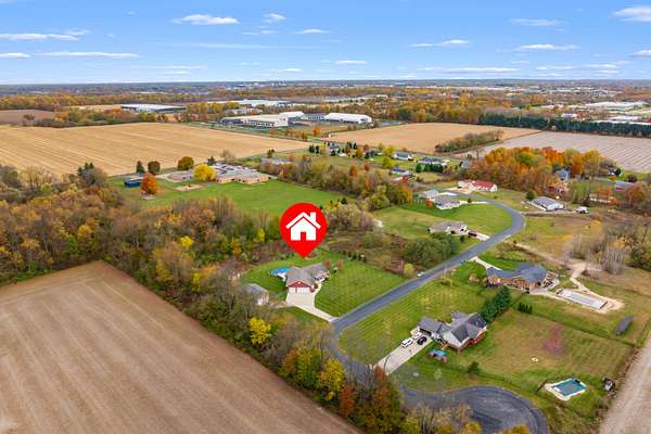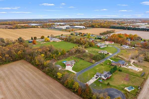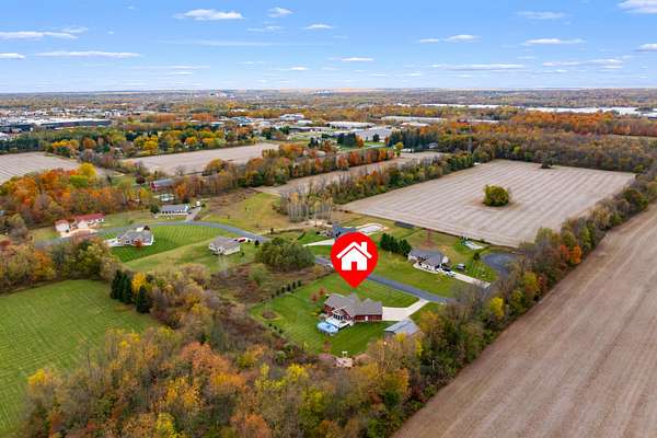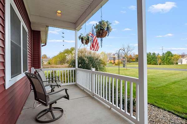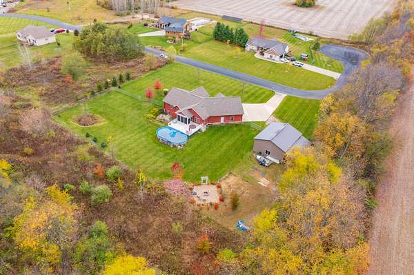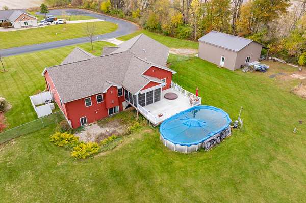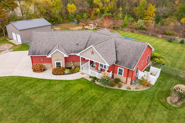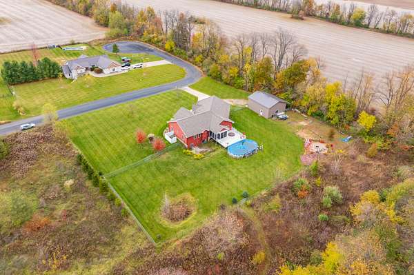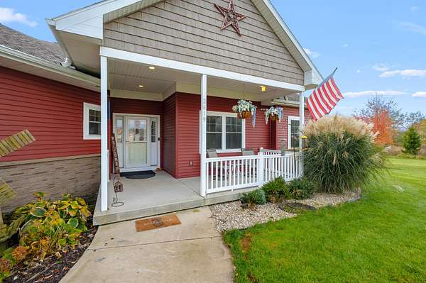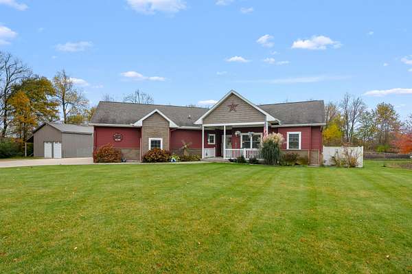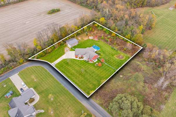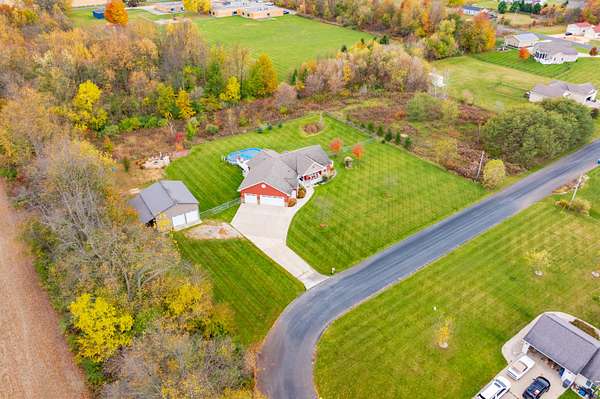 Welcome home to a modern farmhouse that feels both timeless and current. Set on nearly 2 peaceful acres at the end of a quiet cul-de-sac, this custom 2017 ranch blends thoughtful design with everyday comfort. Inside, 9' ceilings and vaulted spaces center around a cozy gas fireplace, while the granite kitchen shines with stainless appliances, soft-close cabinets, under-cabinet lighting, and main floor laundry. The primary suite offers a dual vanity, walk-in closet, and private retreat. Downstairs, a full in-law suite adds a kitchen with butcher block counters, bedroom, bath, and family room. Relax in the three-season porch, under the automatic awning, by the fire pit, or in the pool and hot tub overlooking a fenced yard with a 1,500-gallon dry well for drainage. A 1,200 sq. ft. pole barn expands storage and hobby options, complemented by a 3-car garage, whole-house generator, and attic fan. Minutes from Kalamazoo, yet a world away in peace and privacy. This home has it all!