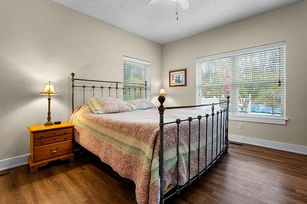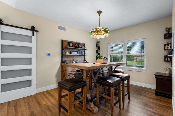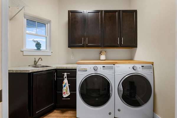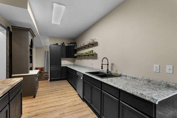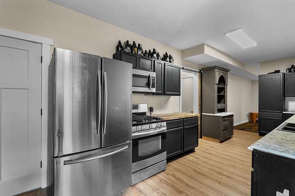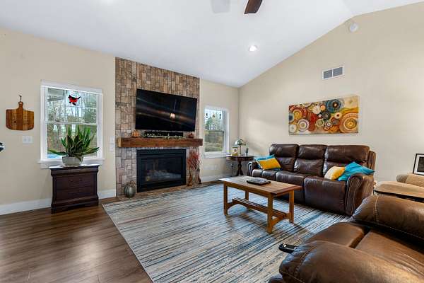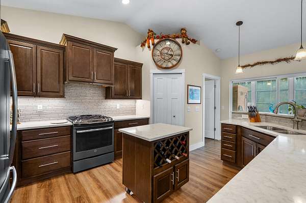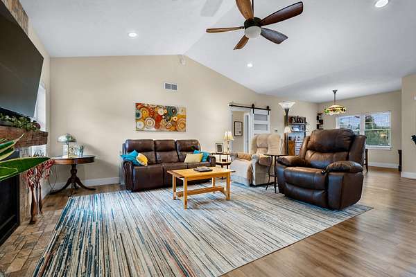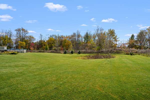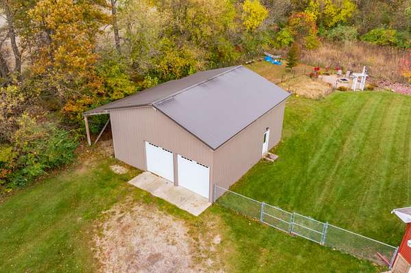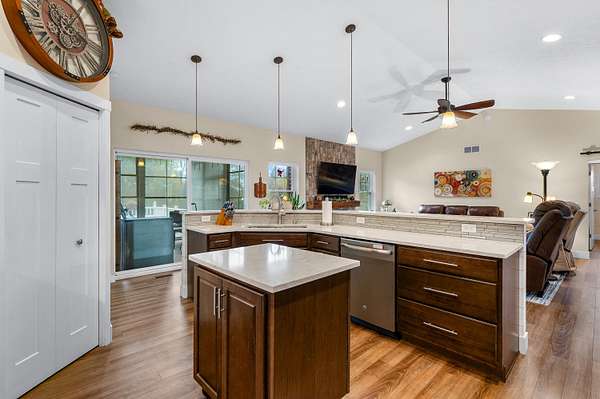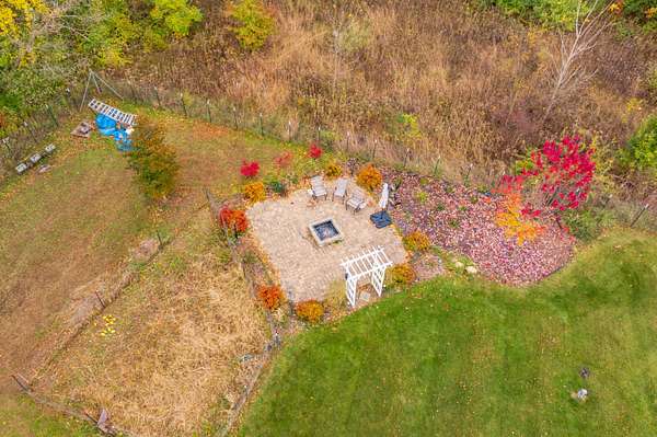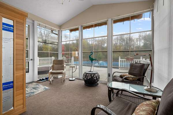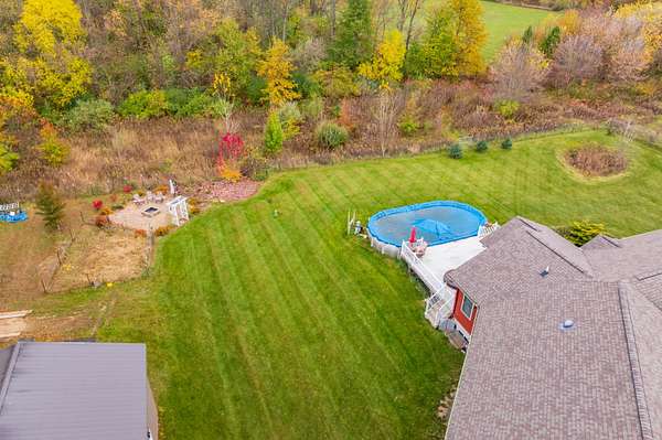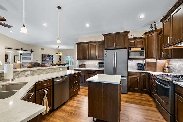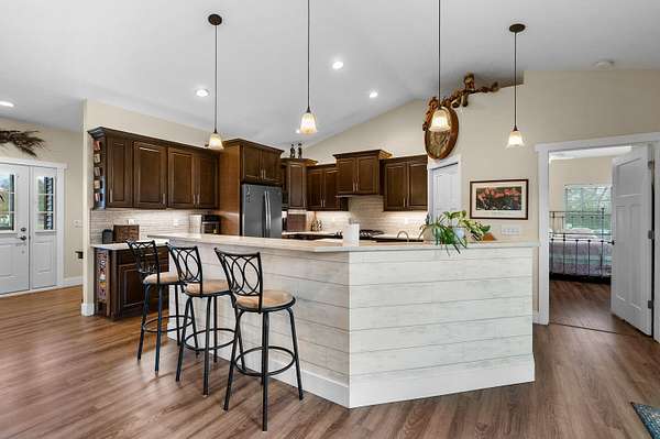 Welcome home to a modern farmhouse that feels both timeless and current. Set on nearly 2 peaceful acres at the end of a quiet cul-de-sac, this custom 2017 ranch blends thoughtful design with everyday comfort. Inside, 9' ceilings and vaulted spaces center around a cozy gas fireplace, while the granite kitchen shines with stainless appliances, soft-close cabinets, under-cabinet lighting, and main floor laundry. The primary suite offers a dual vanity, walk-in closet, and private retreat. Downstairs, a full in-law suite adds a kitchen with butcher block counters, bedroom, bath, and family room. Relax in the three-season porch, under the automatic awning, by the fire pit, or in the pool and hot tub overlooking a fenced yard with a 1,500-gallon dry well for drainage. A 1,200 sq. ft. pole barn expands storage and hobby options, complemented by a 3-car garage, whole-house generator, and attic fan. Minutes from Kalamazoo, yet a world away in peace and privacy. This home has it all!