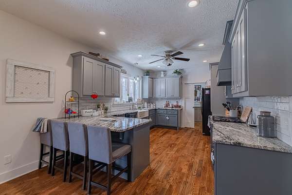 The interior features 9-foot ceilings throughout, an open-concept design, and wood flooring that creates a warm, inviting feel. The kitchen is both functional and stylish with granite countertops and ample workspace, flowing naturally into the main living and dining areas--perfect for gatherings of any size.
