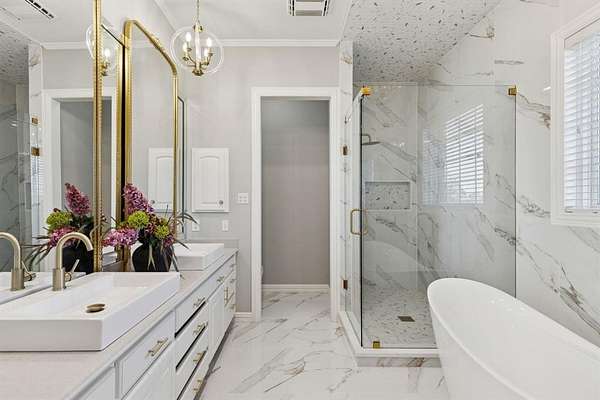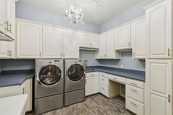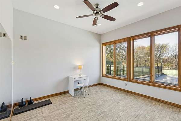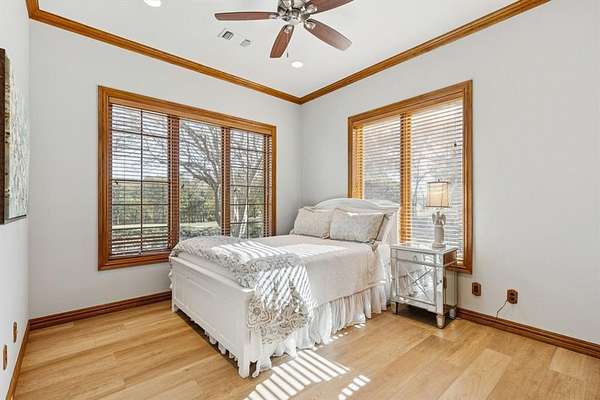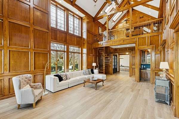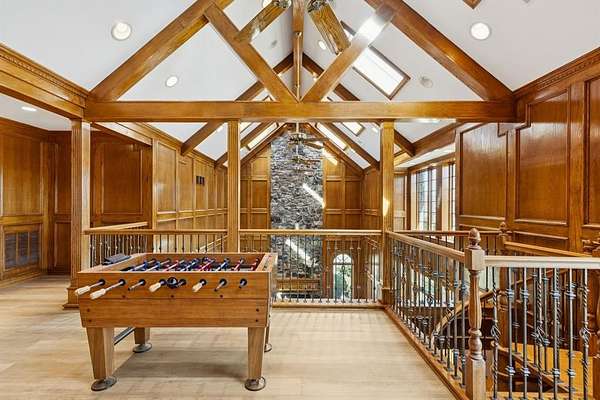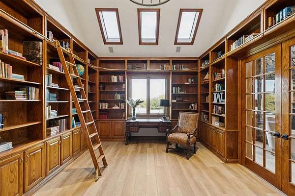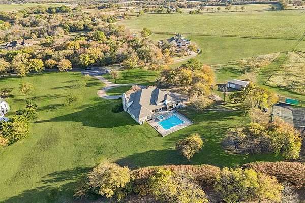 Luxury estate living and thoughtful craftsmanship come together at 362 Woodland Hills, a private cul-de-sac retreat set on 5.11 acres inside the exclusive gated Woodland Hills community, offering an extraordinary blend of scale, privacy, and refined updates. The home welcomes you with a dramatic great room featuring a two story stone fireplace, skylights, custom solid oak, a spiral staircase, Pella casement windows, and a full bar. Additional main level living includes a well appointed family room featuring herringbone stone floors and custom cabinetry, library with a rolling ladder, exercise room, formal dining, and chef's kitchen equipped with an island, double sinks, butler's and walk in pantry, premium appliances includes a SubZero fridge, and under cabinet lights. Extensive 2025 updates include new wide plank flooring, new iron front doors, fully remodeled primary and guest ensuites, and fresh interior paint that brightens and modernizes living spaces. The primary retreat is flooded with light, patio access, large walk in closet, and a beautifully renovated ensuite. Upstairs offers an expansive game room with a mezzanine overlook, custom built ins, and three additional bedrooms with generous closets and ensuite baths. Outdoors, the property delivers a true resort experience with a 24x40 pool, 10x10 spa, outdoor kitchen with grill, granite, fridge, and sink, covered deck with fans, and surround sound equipped entertaining. Additional amenities include a fully lit tennis court, basketball goal, and convertible volleyball setup, a stocked lake for fishing, 36x24 metal barn with overhead doors, a private well, whole home water softener and filter, dog kennel, and an orchard of 100 trees producing nuts and fruits. With endless sunsets from the back patio, generous storage, updated mechanicals and newer roof, and a peaceful country setting close to everything, this estate offers rare space, character, and comfort in one of Sherman's most prestigious neighborhoods.