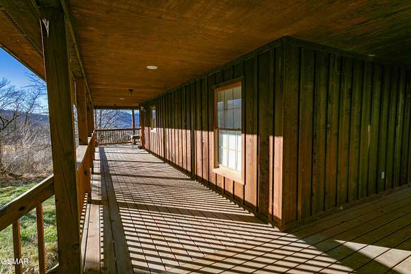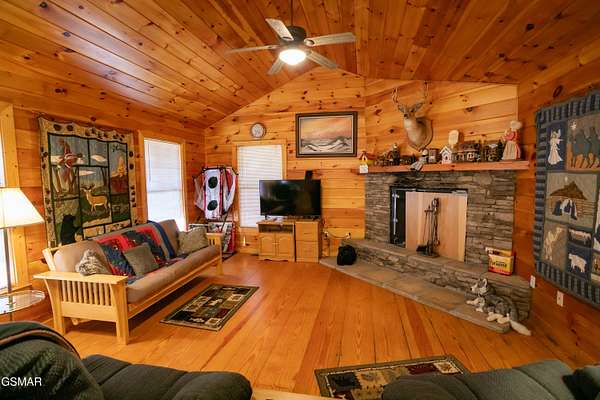 This 2-bedroom, 2-bath home spans 1216 sq ft and is located in the heart of Wears Valley on 2.3 acres of level land at the base of the Smoky Mountains. It features a rustic style, with wraparound porches on all sides, a warm interior highlighted by large pine plank floors, and a stacked stone fireplace. The open-concept design connects the living room and spacious kitchen, which includes an extra-large bar, creating a lodge-like feel. The house has two large tiled bathrooms. The generous lot offers endless possibilities. It is just minutes from the Great Smoky Mountain National Park entrance and close to local attractions, amenities, and entertainment.