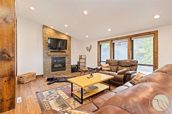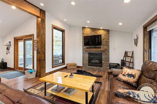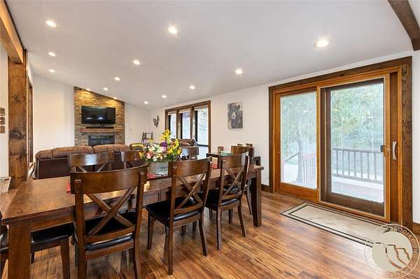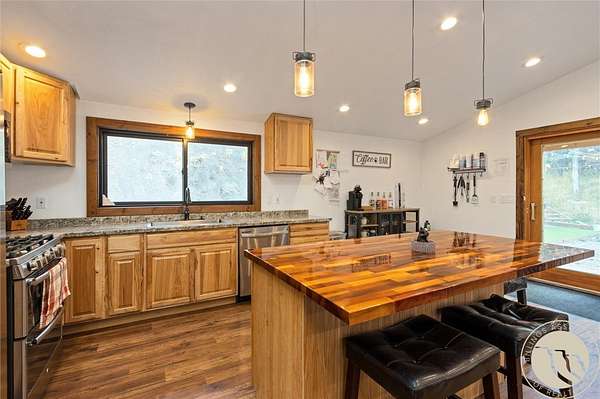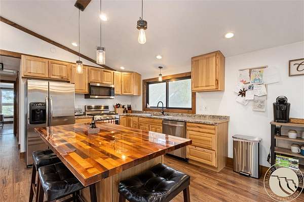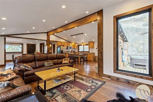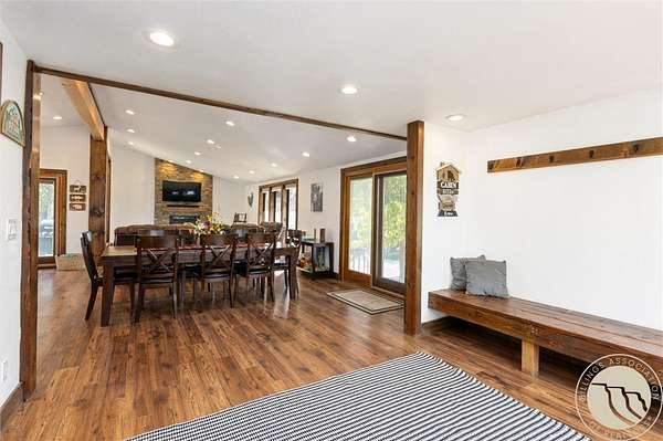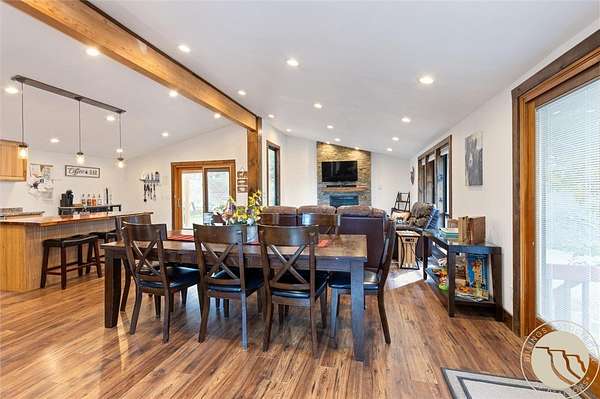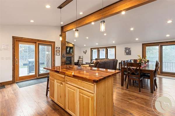 Tucked away in a peaceful setting with views from the deck, this updated 3-bedroom home + bonus room offers space, comfort, & country charm just minutes from town. Open-concept main level features LVP flooring throughout the living, kitchen, & dining area, centered around a cozy gas fireplace. The kitchen showcases stainless steel appliances & an island with extra seating. Large entryway with a built-in bench & hooks. A main-level bedroom & full bath complete the upstairs. Downstairs, you'll find 2 additional bedrooms, a bonus room perfect for an office or guest space, second living area, & laundry room. Enjoy the outdoors from the spacious deck or unwind under the pergola. Firepit area near the hot tub provides even more room for entertaining or quiet relaxation. The 2-car detached garage adds storage & functionality, all surrounded by 4.22 acres of Montana landscape.