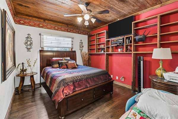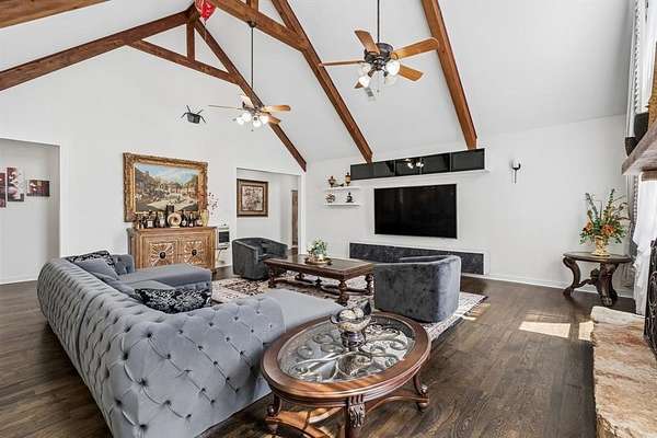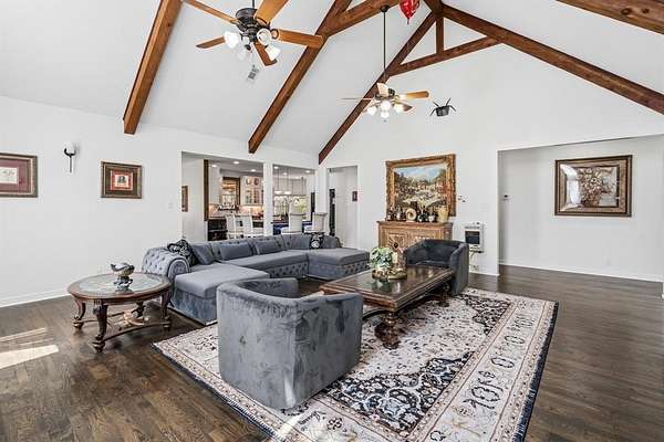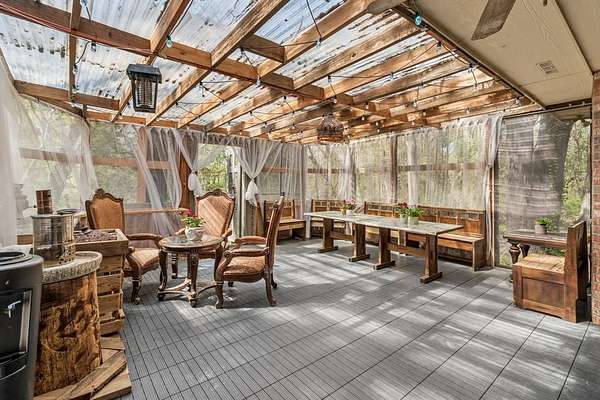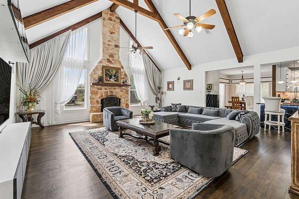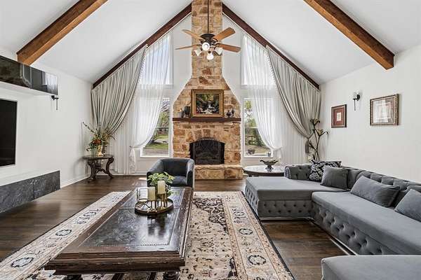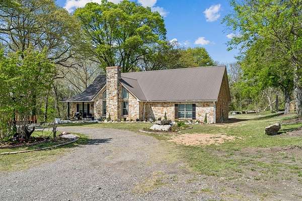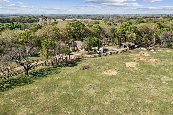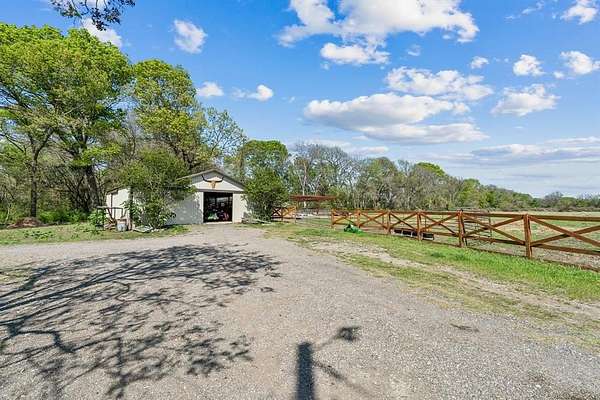 Welcome to your private country retreat- where charm, character and modern comfort come together on 12 plus stunning acres surrounded by mature trees and open pasture. A scenic, winding driveway with beautiful wood fencing sets the tone as you arrive at this gorgeous stone-accented one-story home, offering timeless curb appeal and peaceful seclusion. Step inside to an inviting open layout featuring soaring vaulted ceilings with exposed beams, rich hardwood floors, and a floor to ceiling stone fireplace that creates a warm and impressive focal point. Natural light pours through oversized windows, bringing the beauty of the outdoor in. The fully updated kitchen is a dream, featuring custom cabinetry, sleek countertops, stainless steel appliances, and spacious island all opening seamlessly to a cozy breakfast nook with scenic view. Just of the kitchen enjoy a truly unique feature - an enclosed outdoor living space with wood beams, ambient lighting, and plenty of room for dining and entertaining year around. The Primary suite offers a relaxing retreat, with generous space with amazing master bath with 2 stylish vanities, separate shower and bathtub. Additional bedrooms provide flexibility for quests and office. Outdoor features you will love includes 12 plus acres of beautiful useful land, charming fire pit area in front of the house perfect for gathering under Texas sky, mature trees for shade and privacy, workshop barn ideal for equipment or storage, expansive open pasture perfect for animals, long private driveway with fencing which added character, 3 car garage, and much more. This property offers the ideal blend of peaceful and comfortable ranch living all within convenient reach of nearby highways, shopping and dining. A rare opportunity to own your very own slice of Texas paradise with having the benefit of AG exemption.