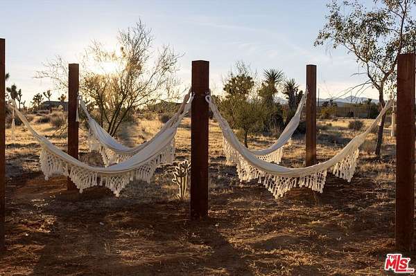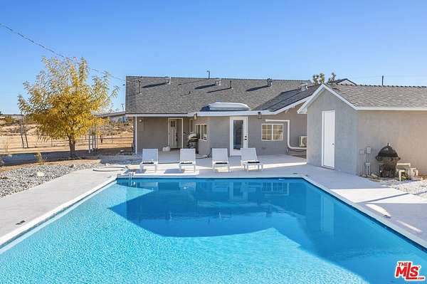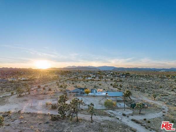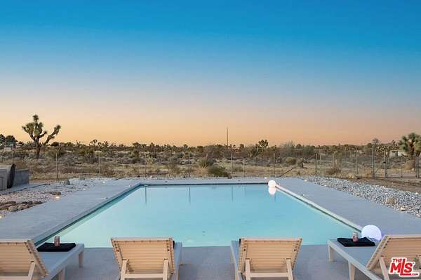 Generating $80,000 in annual gross income, this fully furnished, turnkey 5-bedroom, retreat delivers exceptional short-term rental performance and high-desert luxury. Set on five private acres in Yucca Mesa, the 2,040 sq ft home has been fully remodeled with designer finishes, including luxury vinyl plank flooring, recessed lighting, and a modern kitchen with a new cooktop, Samsung Bespoke refrigerator, shaker cabinetry, and butler's pantry. The open-concept layout is bright and spacious, ideal for entertaining. The primary suite features a spa-inspired en-suite bath, while a fifth bedroom in the pool house offers a private entrance for guests or rental flexibility. Outdoors, enjoy a resort-style setting with an Olympic-sized pool, hot tub, firepit, hammocks, and a custom Linx patio cover, all surrounded by sweeping desert and mountain views. Additional features include RV hookups, 220V carport, a storage unit, and a custom enclosed area suitable for events or parking. With HV/RL zoning, and room to expand, this property offers both immediate cash flow and long-term growth potential just minutes from Joshua Tree National Park and Pioneertown.