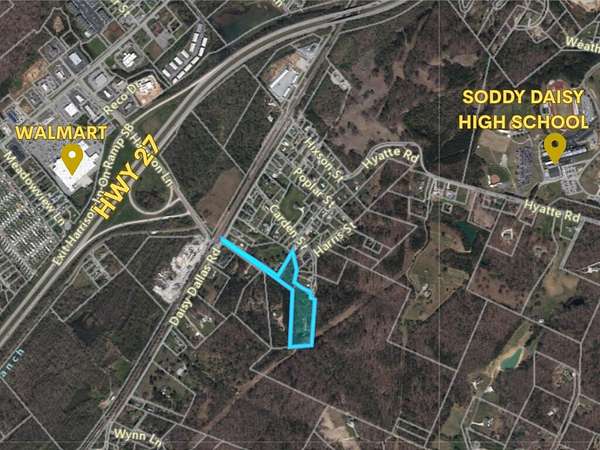 Five-acre parcel in Soddy-Daisy - private, versatile and ready for your plans. Located off Daisy Dallas Rd near Harrison Lane, the lot features flat to gently sloping terrain with large open areas ideal for animals, pasture, or future expansion. An on-site house is present but will require renovation or removal; water and electricity are connected. Septic condition is unknown. Zoned A-1 Agricultural. Property includes two sheds and two large propane tanks (any remaining fuel conveys). Perfect opportunity to create a private retreat or small farm.