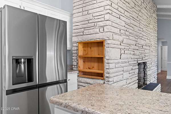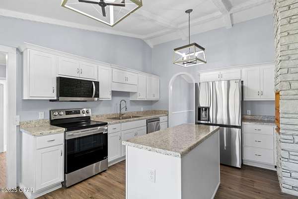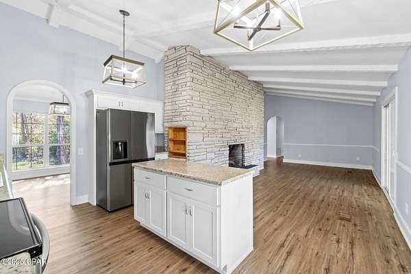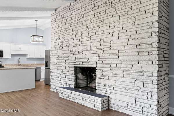 Welcome to 364 Lister Dr - your own private lakefront escape tucked away on one of Wewahitchka's most peaceful stretches of water. This updated home brings together rustic charm, modern comfort, and wide-open views that make every day feel like a getaway. Inside, you'll find a bright, open layout with vaulted, beamed ceilings and a striking full-length stone fireplace that anchors the main living area. The kitchen has been beautifully refreshed with white cabinetry, stainless steel appliances, granite countertops, and a center island that's ready for cooking, gathering, and game-day snacks. Large windows and sliders pull in tons of natural light and frame the lake like a piece of art. Step outside and you'll understand why this property is so special. The huge open porch runs along the back of the home, giving you the perfect spot to relax, grill, or watch the sun dip over the water. The backyard opens right up to the lake with plenty of room to cast a line, launch a kayak, or build the dock setup of your dreams. Whether you're into fishing, boating, or just soaking in the quiet - this place delivers. The home sits on a generous, private lot surrounded by mature trees and nature. Fresh updates throughout make it move-in ready, so you can focus on enjoying the good stuff: the breeze, the view, and the laid-back lifestyle Wewa is known for. If you've been looking for a lake house with character, space, and unbeatable scenery, this is the one. Come see what life on Lister Drive feels like.