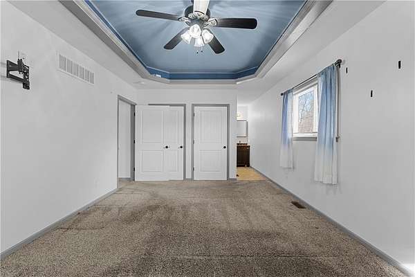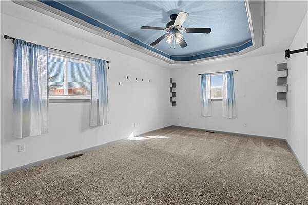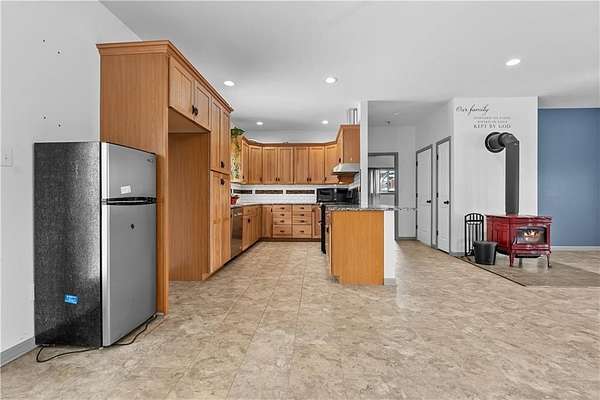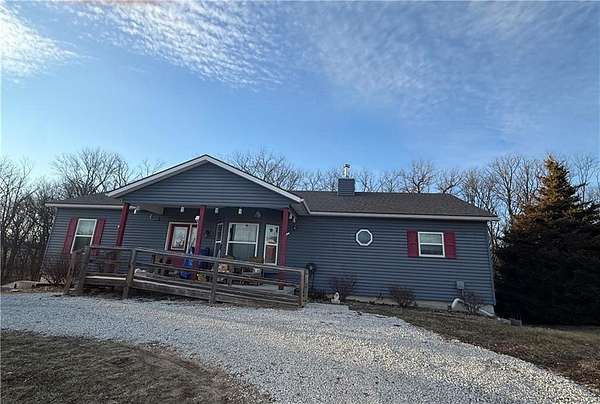 Beautiful 9-year-young reverse ranch on 5 acres with an outbuilding, located on the north side of I-70 with an Oak Grove address and Grain Valley schools. This home offers space, comfort, and room to spread out-inside and out. Enjoy the outdoors from the covered front porch, covered deck, and covered patio, perfect for relaxing with your favorite beverage and taking in the peaceful setting. Inside, the open-concept layout features custom cabinets with soft-close drawers and doors, granite countertops, and a gas stove, creating a functional and inviting kitchen. The primary bedroom is located on the opposite end of the home, offering added privacy from the additional main-level bedrooms. The home includes 6 bedrooms and 3 full baths, providing plenty of room for everyone. The finished basement offers a spacious rec room and bedrooms. Geothermal HVAC delivers energy efficiency and comfort year-round. 2 car oversized garage and 2 laundry areas. All of this just 25 minutes from downtown, combining peaceful acreage living with easy access to the city. Tiny house doesn't stay but can be bought outside of closing.