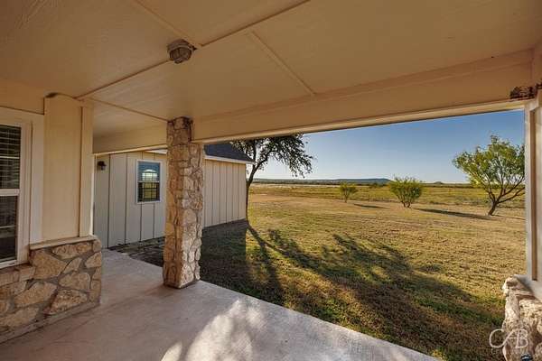 If you've been searching for privacy, wide-open views, and a spacious home that offers room to truly spread out, this 10.20-acre property is the perfect fit. Set well off the road and surrounded by native landscape, this home, built in 2004 with a 2014 addition, offers the peaceful country setting so many buyers are looking for. The semi-open layout creates an easy flow, with a generous bar-height counter connecting the kitchen to the living and dining areas. Stained concrete floors run through the main living spaces, adding both style and practicality, while the bedrooms feature carpet or laminate for comfort. An office area with built-in desk and shelving sits just off the dining room, ideal for remote work or keeping the household organized. The kitchen is beautifully updated with new granite counters, an undermount stainless sink, built-in cabinetry, and a pantry closet. Soaring 10' ceilings and a floor-to-ceiling stone fireplace anchor the living room, where large windows bring in natural light and views of the land. The primary suite offers a peaceful retreat with its walk-in shower, soaking tub, dual vanities set on opposite sides of the room, and a spacious walk-in closet. Two guest bedrooms sit down the hall, along with a full bath featuring a tub-shower combo. The expansive back bedroom includes its own half bath and walk-in closet--perfect for guests, multi-generational living, or a second living area. Outside, the space truly shines. A 28'x28' four-stall carport offers covered parking or extra storage. Beyond the house, a 20'x40' livestock shed with water and a concrete slab provides endless possibilities--washing animals, storing feed, or creating a shaded work area. Pipe pens have already been started and just need finishing. The land itself is mostly cleared, dotted with native grasses and light mesquite regrowth, creating open views and a sense of privacy all around you. If you're seeking space, quiet, and panoramic surroundings--this property delivers!