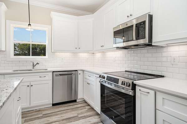 - Built-In Electric Oven, Built-In Electric Range, Dishwasher, Disposal, Microwave, Stainless Steel Appliance(s)