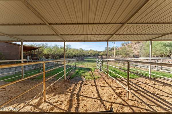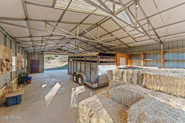 The home is approximately 1,210 square feet and features a functional floor plan with an open living and dining area. The primary bedroom has a full bathroom and walk-in closet. The second bedroom and bathroom are suitable for guests, family, or office use. The home's exterior is finished in wood siding and topped with architectural shingles. A covered deck made of Trex material provides a shaded outdoor area for sitting or hosting. A carport is also included for vehicle protection, with mature trees offering shade and windbreaks. The property's provides clear views of the surrounding hills and desert landscape. Included also is a 32x50 barn/shop with a rv hook spot, shop is fully concreted, along with 5 pens with turn outs.