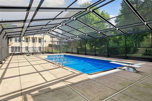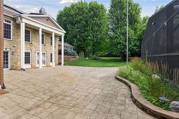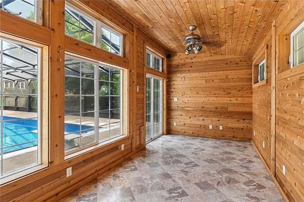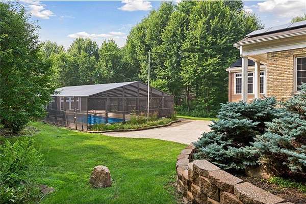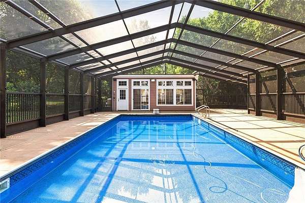 Outside, a large paver patio leads to a screened-in outdoor pool--perfect for critter and bug-free summer gatherings. The pool house offers additional storage and a bright solarium/changing room for guests to relax or refresh. Additional exterior highlights include a large pole shed, a drive-through 4-car garage, and beautifully maintained grounds.