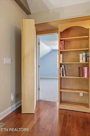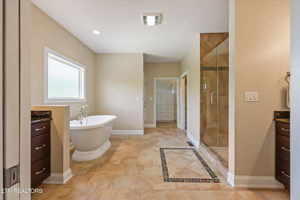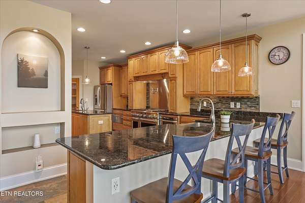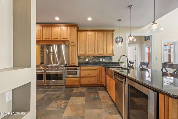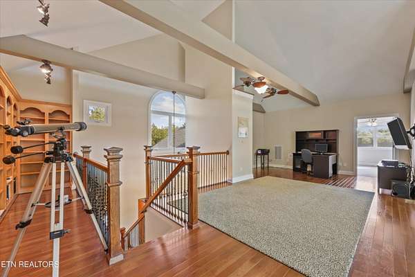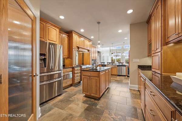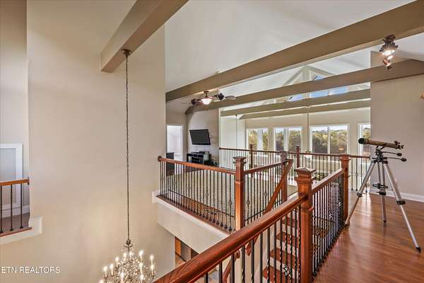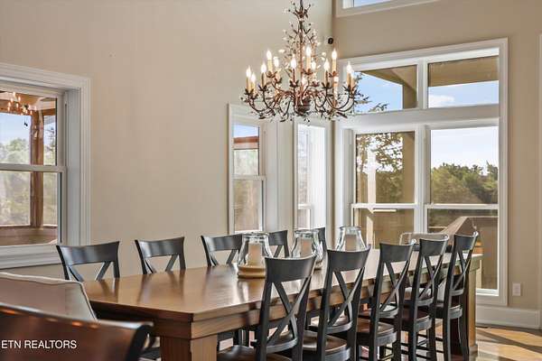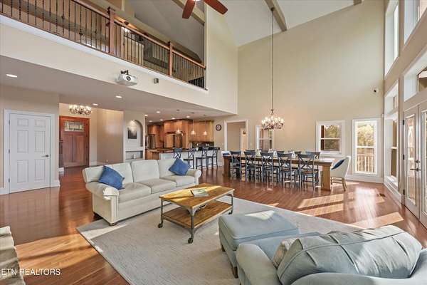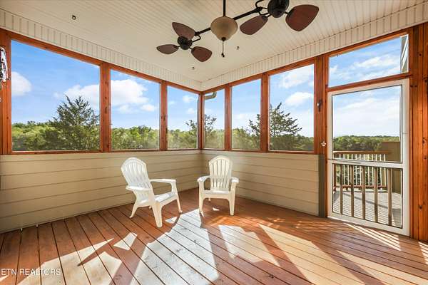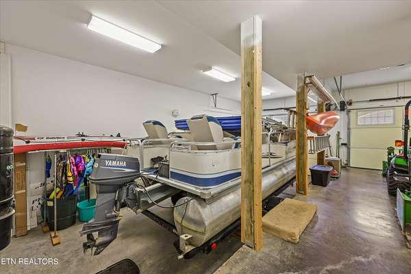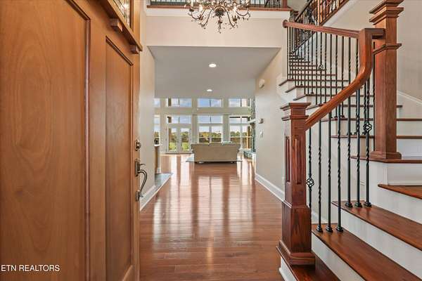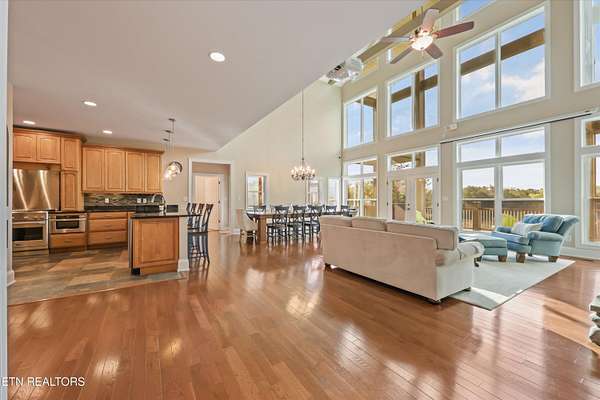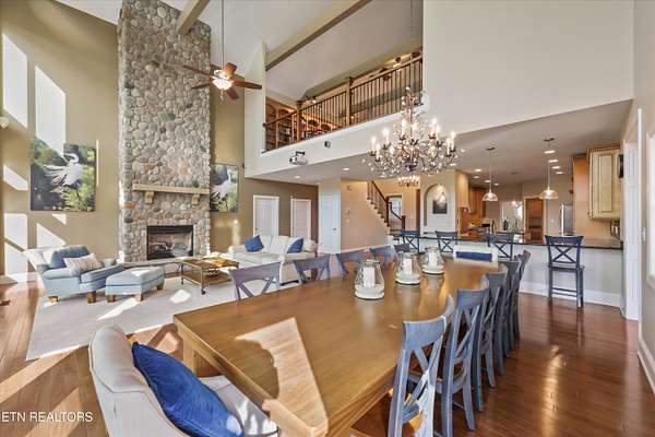 Welcome to an exceptional lakefront retreat, where thoughtful design, expansive acreage, and high-end features create a one-of-a-kind property. Nestled on approximately 6 private acres with nearly 900 feet of shoreline, this stunning 4,400+ sq ft estate offers both tranquility and convenience, located less than 20 minutes from town. From the moment you arrive, the home's timeless Hardy plank siding and inviting wraparound porch set the tone. Step inside to a dramatic living space featuring soaring 30-foot ceilings and a wall of expansive windows that serve as the true focal point-framing breathtaking, unobstructed views of the lake and surrounding mountains. A striking stone-to-ceiling fireplace anchors the space, while rich wood flooring creates an open yet warm atmosphere ideal for both entertaining and everyday living. The main-level primary suite is a private sanctuary with direct porch access, spacious his-and-hers closets with custom built-ins, and a luxurious bath featuring tile floors, walk-in tiled shower, soaking tub, and accessibility features. Additional bedrooms offer comfort and privacy, including a secondary ensuite. The chef's kitchen is equipped with an oversized range, warming drawer, wine fridge, dishwasher, microwave, and trash compactor. A screened-in porch extends the living space outdoors, while a three-story dumbwaiter adds convenience. The walk-in pantry provides ample storage. Upstairs, a custom-built library loft overlooks the living area and captures stunning views. This level also includes two expansive bonus rooms and a full bath, offering flexibility for additional bedrooms, office, or recreation space. Built for efficiency, the home features 2x6 exterior walls, enhanced insulation, and an advanced four-zone geothermal HVAC system with three ground heat-sink wells. A desuperheater repurposes waste heat into the tankless water system, contributing to low average utility costs. The property offers incredible flexibility with approximately 2,700 sq. ft of unfinished, fully plumbed space, plus a heated and cooled basement area ideal for recreation or future expansion, including a potential kitchen and bath. Additional features include a custom library, mudroom, central vacuum, and laundry room with an extra sink. The oversized 4-car garage includes separate bays and an extra-deep lower level designed for pontoon boat storage, along with a workshop area featuring a sink and custom workbench. Outdoors, enjoy a TVA-approved covered dock with aluminum and IPE decking, water and electric access, and a lake-fed irrigation system. The property includes a fenced, elevated garden with drip irrigation and an outdoor shower - perfect after a day on the lake. Seasonal water levels typically reach the tree line by mid-May. Additional highlights include a backup generator, a buried propane tank, a water filtration system, and no HOA - just a voluntary $500/year road maintenance fee. This is more than a home - it's a private, thoughtfully engineered lakefront estate offering luxury, efficiency, and unmatched natural beauty. Schedule your private tour today!