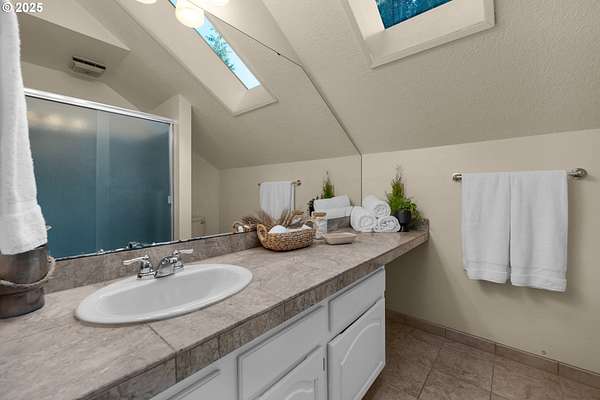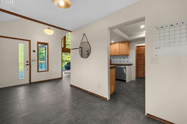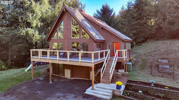 Youngs River A-frame on 2.23 private acres with a dramatic two-story great room, vaulted ceilings, expansive windows, and a cozy woodstove. The kitchen features stainless appliances, and a brand new bathroom by Bergerson Tile adds fresh style.The vaulted primary bedroom includes a skylit bath with a built-in vanity. Two additional bedrooms and another full bath provide comfortable living space, and recent updates include a heat pump, refreshed interiors, and upgraded bedroom windows.The daylight basement offers exterior access plus two finished rooms for office, studio, fitness, or extra hangout space. A 30x40 shop, lean-to, equipment shed, raised garden beds, berries, fruit trees, perennials, and seasonal wild mushrooms complete this Pacific Northwest setting.