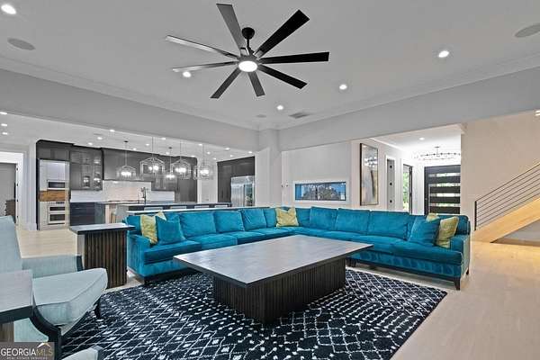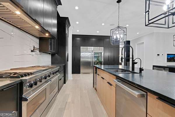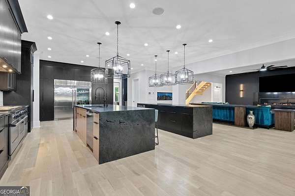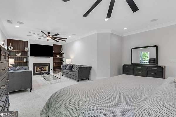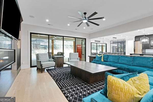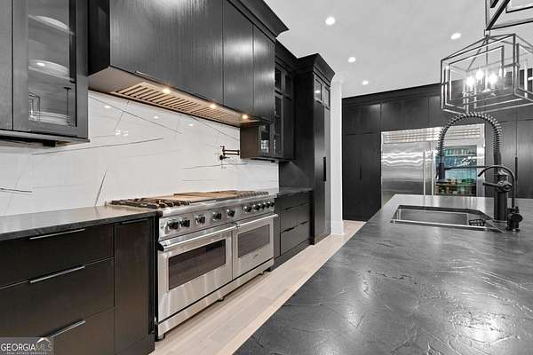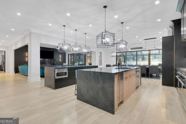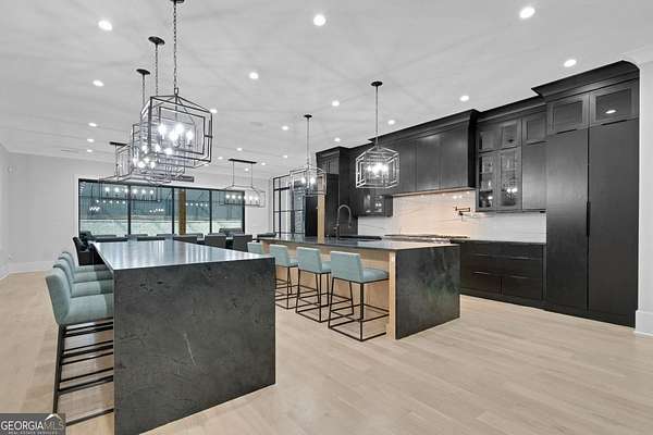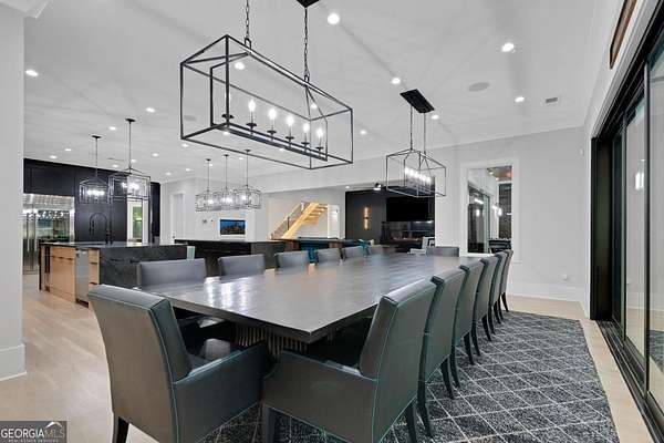 Exceptional custom estate offering an unparalleled blend of scale, craftsmanship, and resort-style living. Privately situated behind a gated entry, this expansive residence features 9 bedrooms and 9.5 bathrooms, thoughtfully designed for both elevated everyday living and grand entertainment. From the moment you arrive, the property makes a statement with a 5-car garage, extensive hardscaping, and a travertine-clad front patio that gracefully wraps the home, creating a seamless transition to the rear outdoor living spaces. The property also features a built-in basketball goal positioned on the main driveway, adding a unique recreational element upon arrival. The backyard is a true retreat-complete with a heated resort-style pool with attached spa, putting green, and turf playground. Entertain year-round on the covered rear patio featuring a gas-start wood-burning fireplace, infrared heaters, and a fully equipped outdoor kitchen with a pizza oven, gas grill, double burner, and sink, or unwind in the screened patio overlooking the pool. A dedicated pool bath and GNEX generator provide both convenience and peace of mind. The main level showcases refined living at every turn, including a double-island chef's kitchen highlighted by black leather quartz countertops, complemented by a secondary butler's kitchen, and outfitted with commercial-grade refrigeration, including a stainless-steel TRUE refrigerator and freezer system. Designed for entertainment, the home offers a theater room, wine cellar, and billiards lounge, along with a dramatic living area featuring pocket doors that open seamlessly to the outdoor living space. Additional highlights include a private office, mudroom, main-level guest suite, and a private wellness suite with sauna. A custom built-in aquarium feature further elevates the ambiance. Upstairs, you will find six oversized en-suite bedrooms, along with a well-appointed laundry suite featuring General Electric dual washer and dryer units, sink, and abundant storage. The owner's suite is a true private retreat, complete with a spacious sitting area and dual his-and-her walk-in closets, thoughtfully designed with a dedicated washer and dryer combo and a freestanding refrigerator in one closet for added convenience and luxury. The spa-inspired primary bath features dual vanities, separate his-and-her water closets, a soaking freestanding tub, and an oversized shower with body jets. No detail has been overlooked in the home's infrastructure and technology, including a fully integrated smart home system, CAT6 wiring throughout, a whole-home audio system, dimmable lighting, Culligan water filtration system, and dual 500 lb. tankless water heaters. Every bedroom is generously sized with high ceilings, and each ensuite bathroom is thoughtfully appointed with bidet toilets, reflecting a commitment to comfort and modern luxury. Architectural details include oversized 7-foot interior doors throughout, enhancing the sense of scale and elegance, along with architectural shingle roofing for durability and refined curb appeal. Above the garage, a bonus room with existing water connection offers the opportunity for a future kitchenette, providing flexibility for guest quarters, in-law suite, or private studio space. This estate represents a rare opportunity to own a home where thoughtful design, advanced systems, and resort-caliber amenities come together to create a truly exceptional living experience.