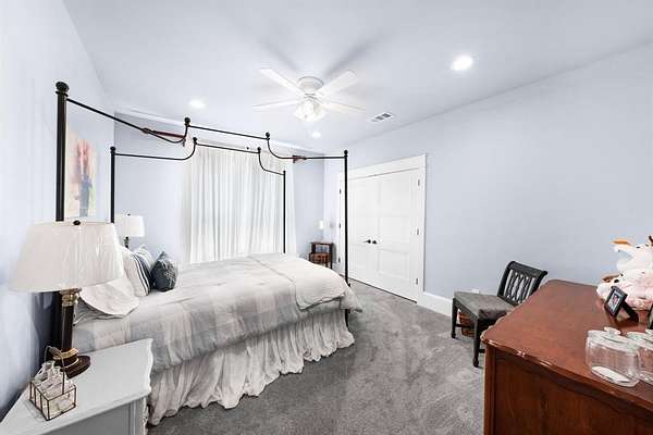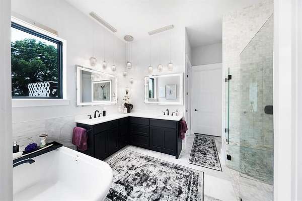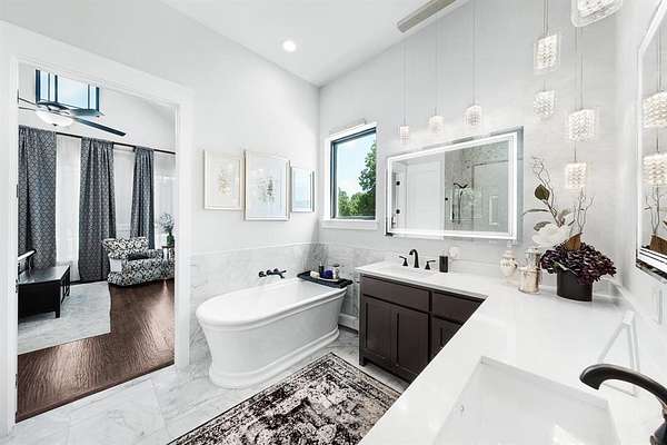 The primary suite is a serene retreat with a spa-like bath and dual walk-in closets--one for fashion, the other thoughtfully designed for storage and utility. The oversized laundry room doubles as a mudroom and workspace with built-ins, workstation, sink, and drying racks. Upstairs, a spacious game room with a mini kitchen offers additional entertaining flexibility.