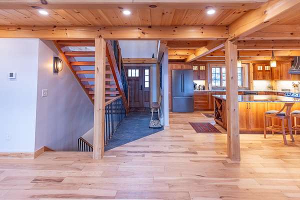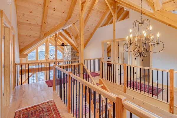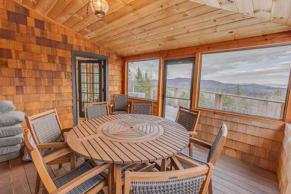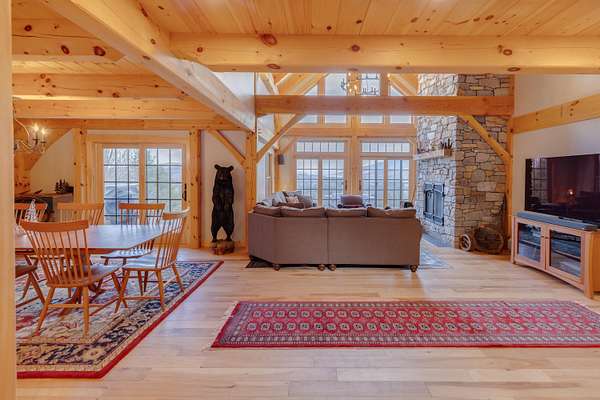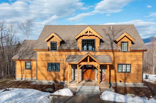 Where timber, stone, and sky meet, an extraordinary mountain sanctuary unfolds in the heart of New Hampshire's White Mountains. Set on 6.4 private acres in the peaceful town of Benton, this custom-built Adirondack timber frame residence was completed in 2023 and thoughtfully positioned to capture breathtaking panoramic views of the Kinsman Range and distant Vermont peaks. Designed to embrace its natural surroundings, the home is a masterful expression of timeless craftsmanship and modern luxury. The great room serves as the dramatic centerpiece of the home, where soaring timber beams and walls of glass frame sweeping alpine vistas. A commanding stone hearth from locally sourced Vermont stone anchors the space, creating an atmosphere both grand and inviting. High-end wood flooring and fine finishes reflect the quality rarely found in newly built mountain homes. The main level offers the ease of single-floor living with a primary suite at one end and an additional bedroom, laundry, and a 3/4 bath at the other. Upstairs, 3 additional bedrooms and 2 well-appointed baths offer welcoming accommodations for guests, each space thoughtfully designed to capture the surrounding views. The walk-out lower level introduces a more relaxed retreat, where a spacious Rec room centered around a cozy wood stove invites evenings of warmth after a day of skiing. Two additional flex rooms offer additional sleeping quarters or potential for a home gym or office. Outside, cedar shake siding and stunning architecture blend with the forested setting. Despite its sense of seclusion, the property is ideally located just 30 minutes from the slopes of Cannon and the vibrant mountain town of Lincoln, with fairly quick access to I-93 or I-91. Shopping, hospitals, and other amenities are only about 10 minutes away in nearby Woodsville. Schedule a private showing today and view this ultimate White Mountain retreat!