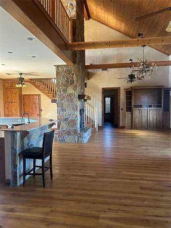 Large ranch house ready for move in. Two story home with office area upstairs and fireplace. Fireplace in kitchen and living area. Open kitchen area with gas appliances. Split bedroom design.