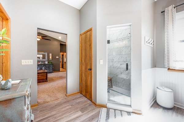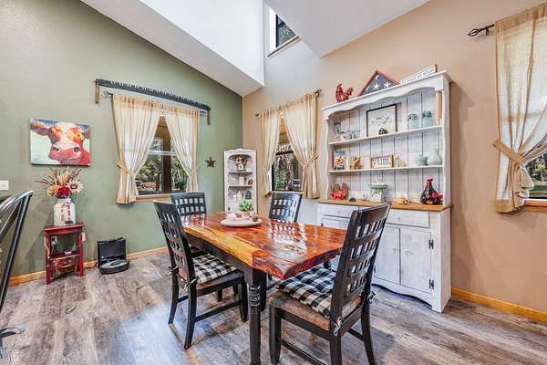 - Ceiling Fans(s), High Ceilings, Living Room/Dining Room Combo, Open Floorplan, Primary Bedroom Main Floor, Solid Surface Counters, Solid Wood Cabinets, Split Bedroom, Thermostat, Vaulted Ceiling(s), Walk-In Closet(s), Window Treatments