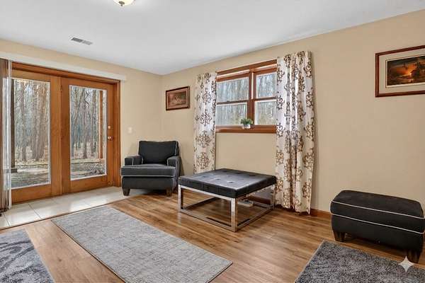 Nestled in Harbor Country at the end of a private, tree-lined road, this uniquely striking home offers exceptional privacy on just over 10 beautifully acres. Enjoy scenic trails, abundant wildlife, and a barn ideal for your animals. Inside, bright natural light fills the space through framed casement windows and vaulted ceilings. The eat-in kitchen features stainless steel appliances, & granite countertops. A floor-to-ceiling stone, wood-burning fireplace anchors the living area. The main level offers 3 bedrooms and 2 baths, including a primary suite with a full shower and jetted tub. The walkout lower level has a very large family room & includes a full bath, laundry/utility room, and two bedrooms which is great flex space. Two wells on the property. Conveniently located just minutes from downtown Sawyer and I-90.