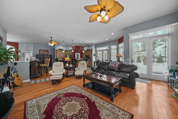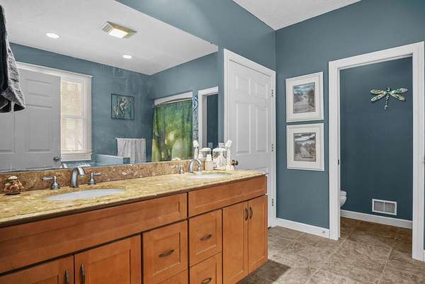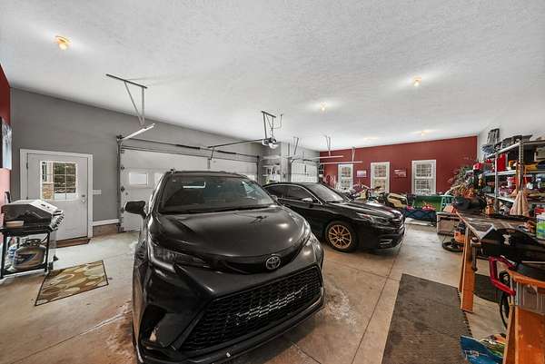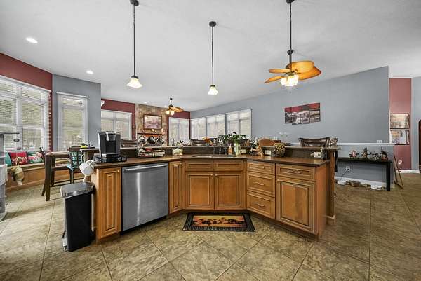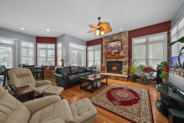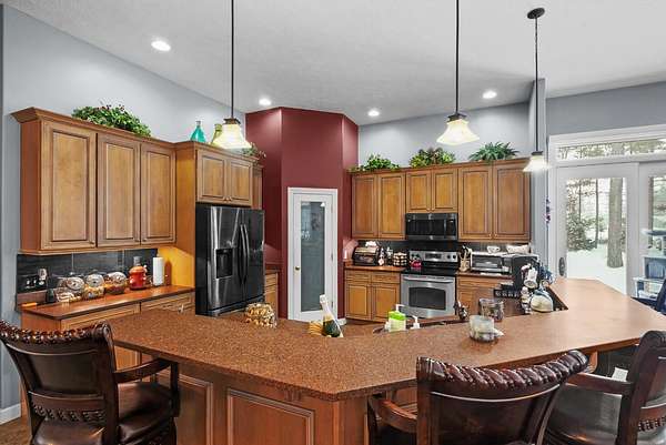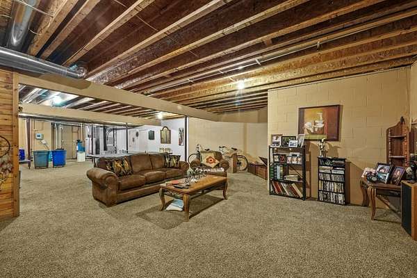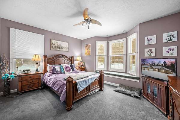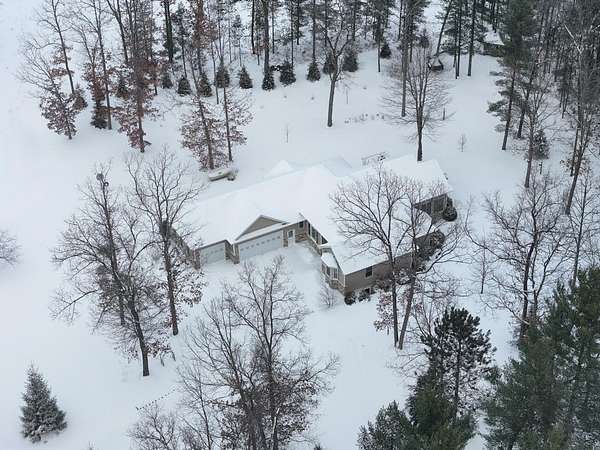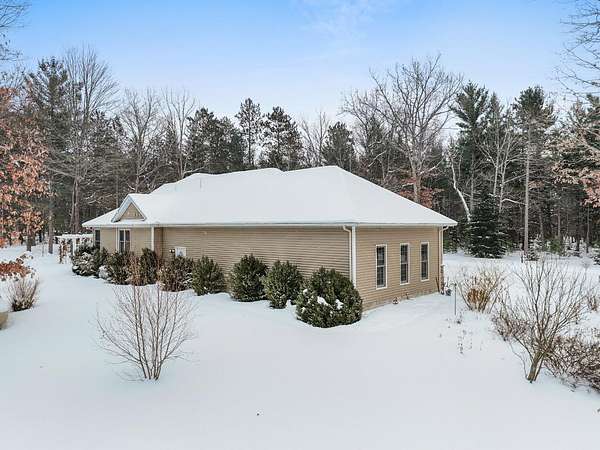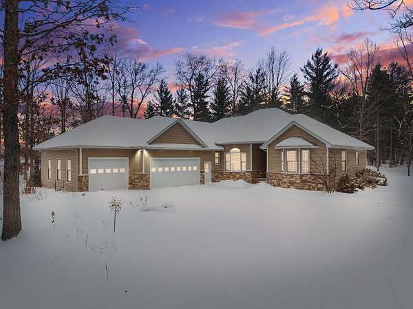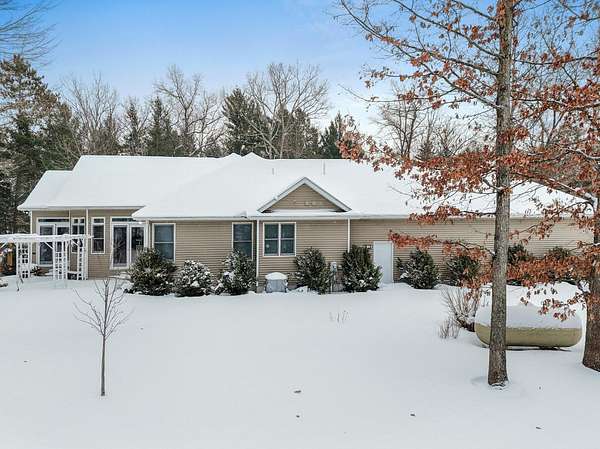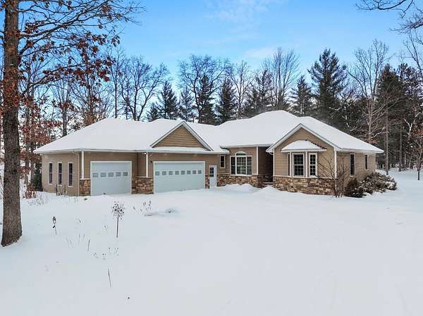Set on five private acres this well-designed home offers a peaceful setting surrounded by nature. Large windows throughout provide abundant natural light and views of the backyard and wildlife. The split floor plan features a spacious primary suite with cove ceilings, rounded doorways, and a Jacuzzi tub. Two additional bedrooms include window seats and share a Jack-and-Jill bathroom with separate sinks and toilets. The mostly finished basement adds a large family room, full bathroom, and egress windows. Mature landscaping enhances the setting, and the three-car garage adds convenience and storage.