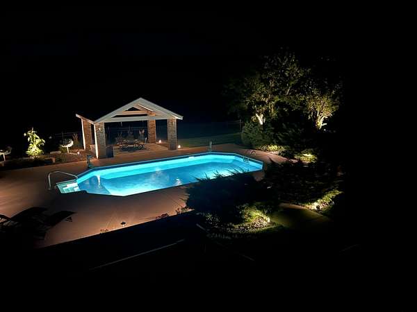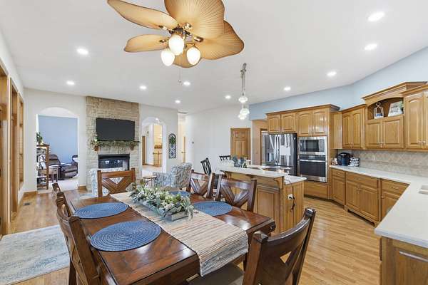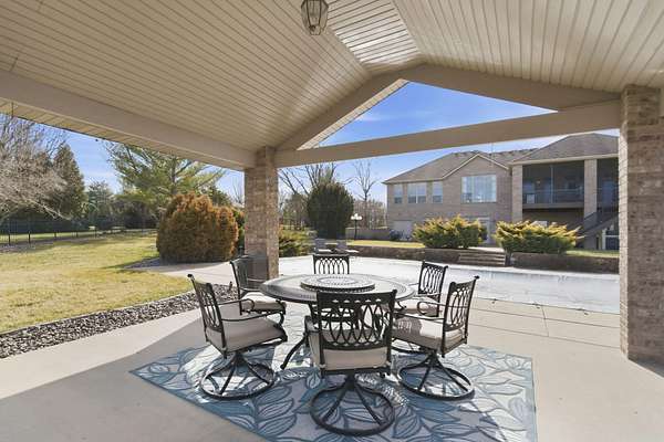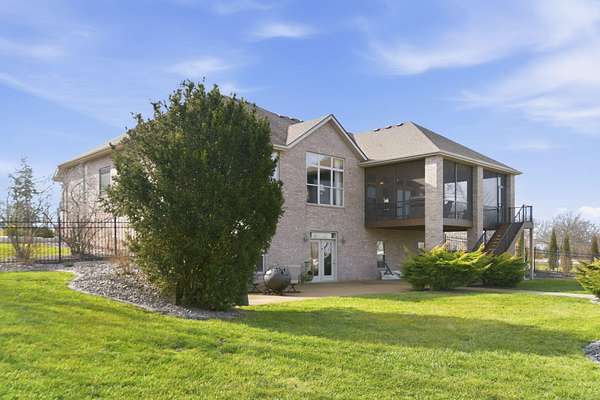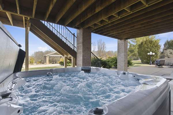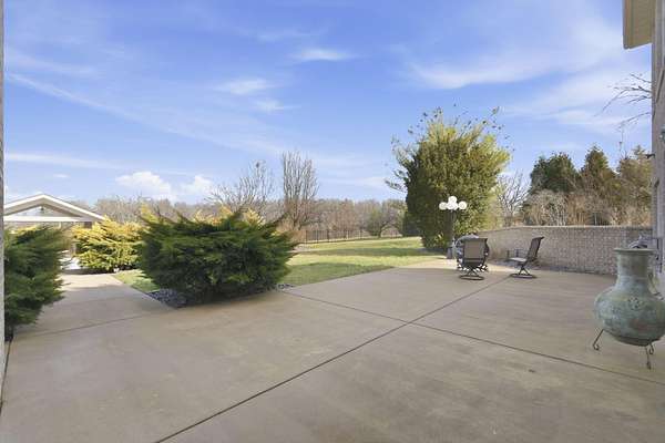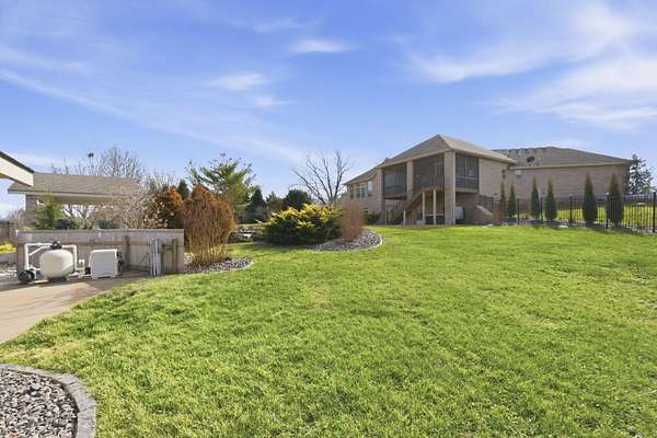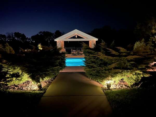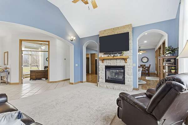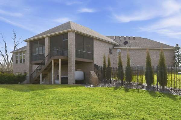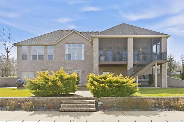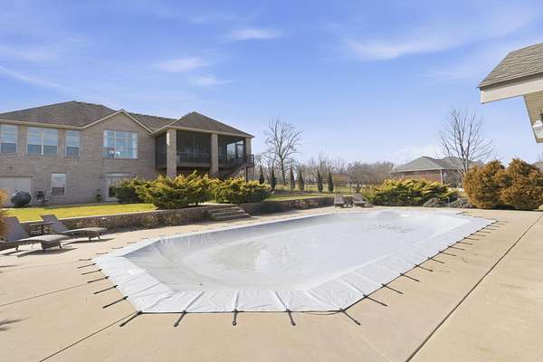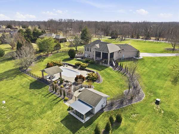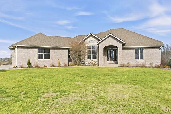 Welcome to this all brick walkout basement home nestled on 3.5 acres in Ozark, offering space, privacy, and your own backyard oasis complete with a 39x19 inground pool. Inside the covered front entrance, you are greeted by a spacious living room featuring vaulted ceilings and a stunning see through stone fireplace that creates a warm focal point between living areas. Just off the entry is a bright front office, perfect for working from home. The kitchen is designed for gathering with wood cabinets, stainless appliances, tile backsplash, island with barstool seating, and an attached dining area. A cozy hearth room sits just off the kitchen, and nearby you will find a powder room and a laundry room with sink and folding table. The main floor primary bedroom offers a private retreat with dual sink vanity, walk in tiled shower, jetted tub, vanity area, and a large walk in closet. The walkout basement features a spacious second living area with wet bar, fireplace, and access to the covered lower patio, along with two additional bedrooms and a full bath, ideal for teenagers or guests. A John Deere room provides excellent storage space and includes a dog wash station! Step outside to enjoy the screened in porch, covered patio lounge area, hot tub that is negotiable with the sale, pool house with covered dog runs, and metal fenced area, all surrounded by the beauty of acreage living while still being close to Ozark amenities.