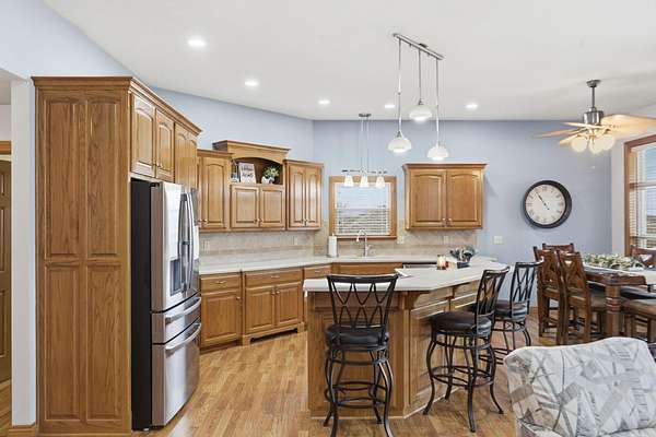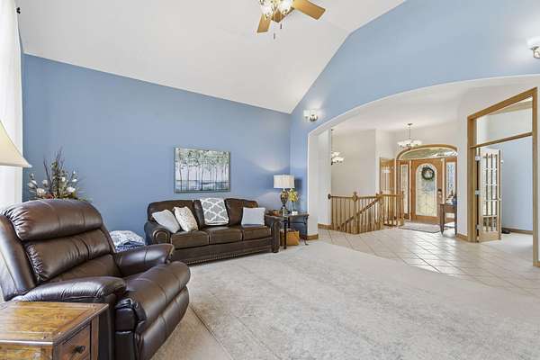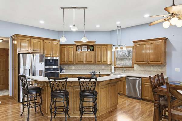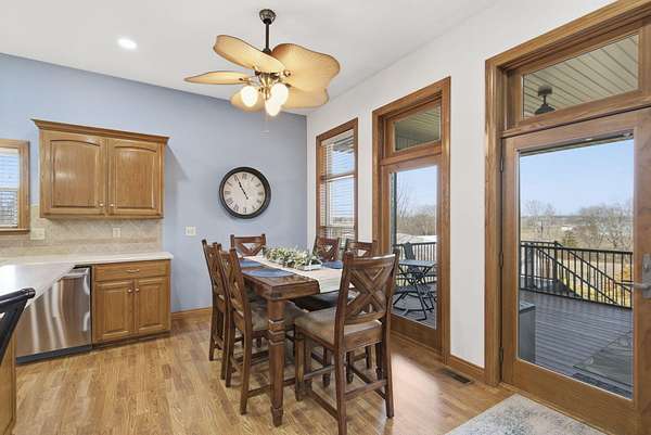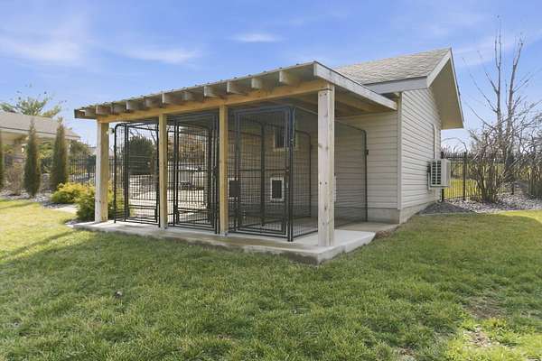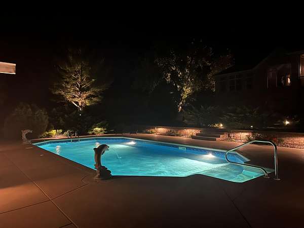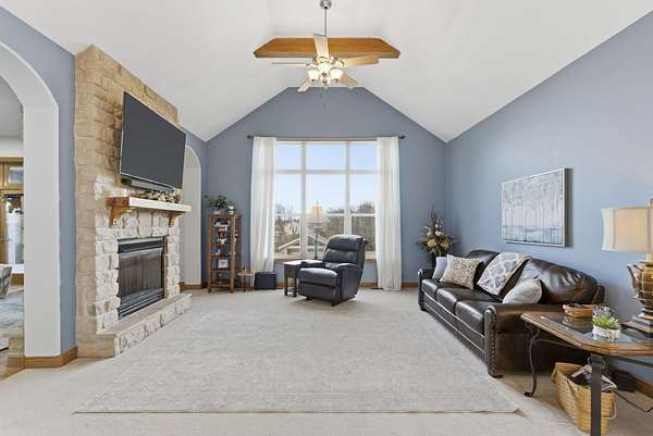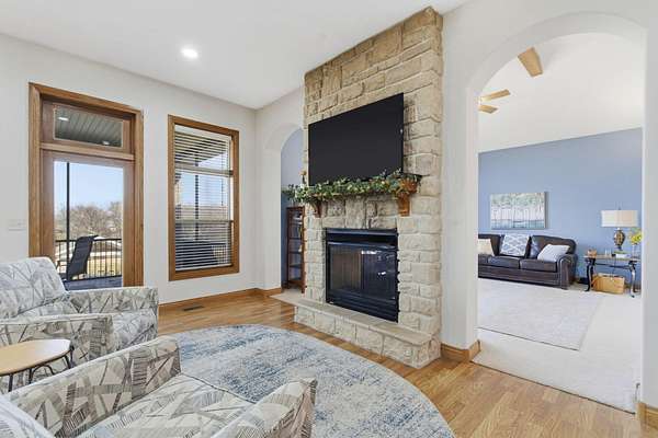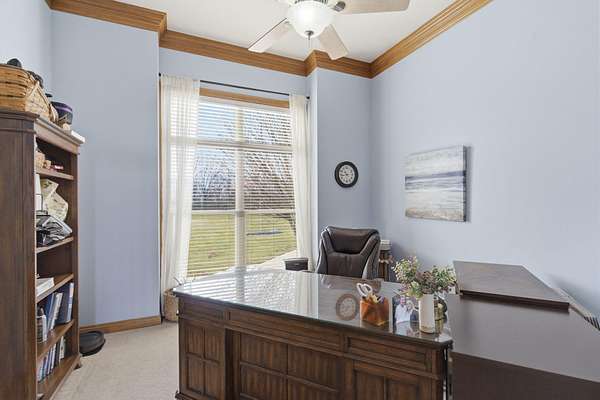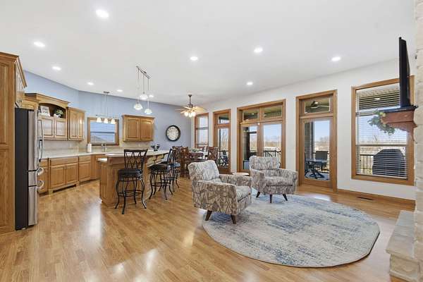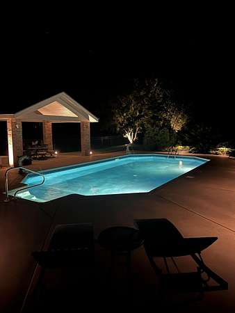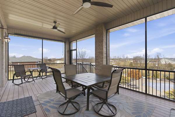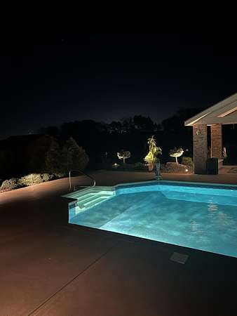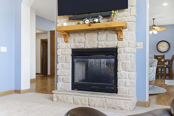 Welcome to this all brick walkout basement home nestled on 3.5 acres in Ozark, offering space, privacy, and your own backyard oasis complete with a 39x19 inground pool. Inside the covered front entrance, you are greeted by a spacious living room featuring vaulted ceilings and a stunning see through stone fireplace that creates a warm focal point between living areas. Just off the entry is a bright front office, perfect for working from home. The kitchen is designed for gathering with wood cabinets, stainless appliances, tile backsplash, island with barstool seating, and an attached dining area. A cozy hearth room sits just off the kitchen, and nearby you will find a powder room and a laundry room with sink and folding table. The main floor primary bedroom offers a private retreat with dual sink vanity, walk in tiled shower, jetted tub, vanity area, and a large walk in closet. The walkout basement features a spacious second living area with wet bar, fireplace, and access to the covered lower patio, along with two additional bedrooms and a full bath, ideal for teenagers or guests. A John Deere room provides excellent storage space and includes a dog wash station! Step outside to enjoy the screened in porch, covered patio lounge area, hot tub that is negotiable with the sale, pool house with covered dog runs, and metal fenced area, all surrounded by the beauty of acreage living while still being close to Ozark amenities.