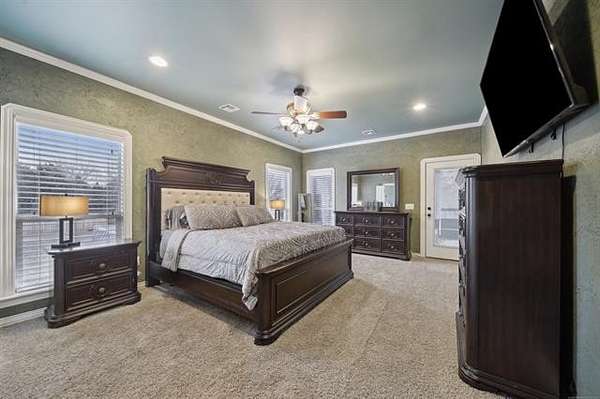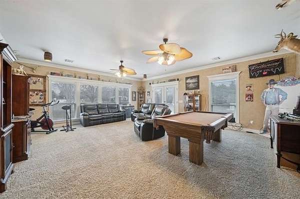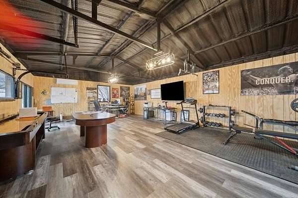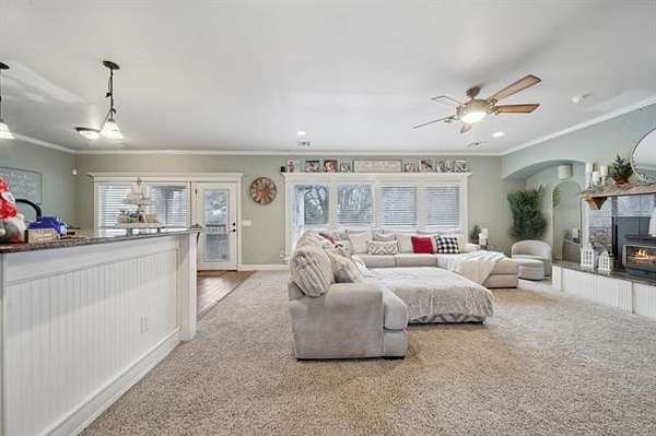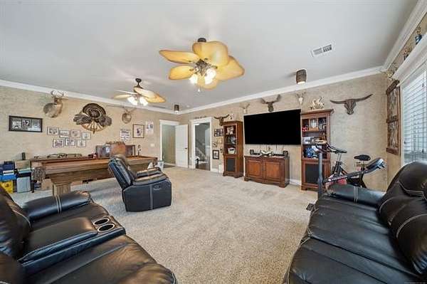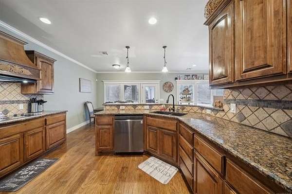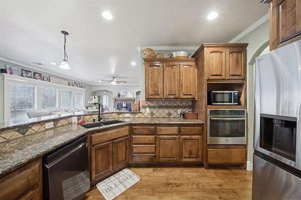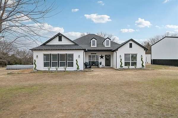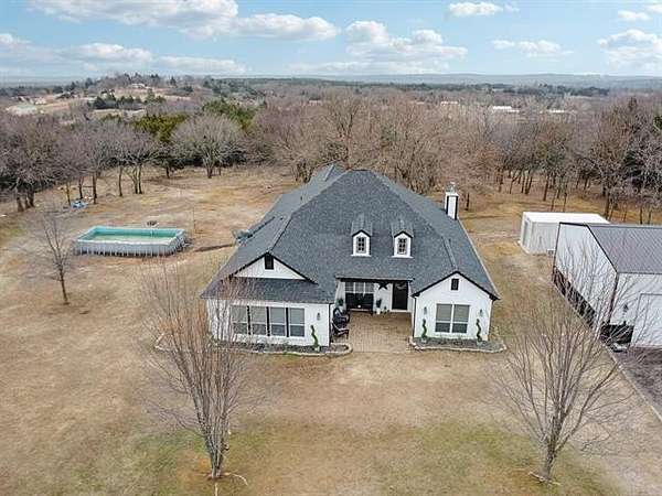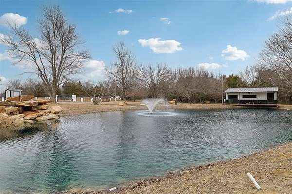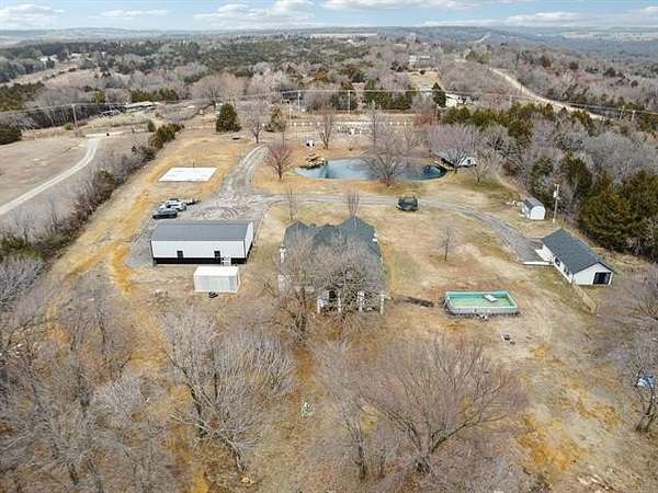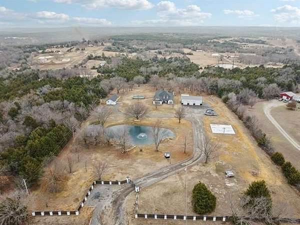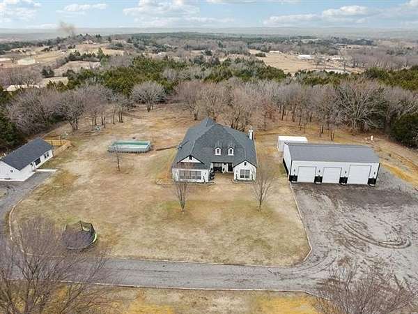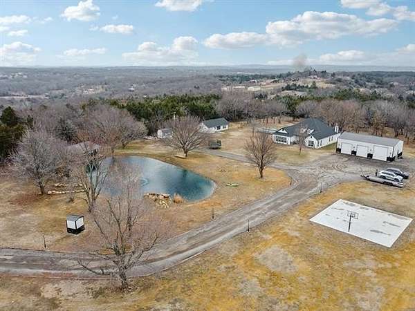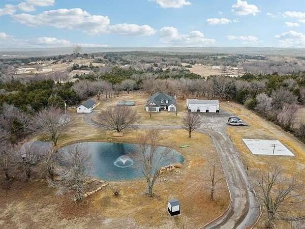 This gorgeous 3,453 sq ft (per courthouse) home sits on 5 acres, has 4 bedrooms, 2 baths, detached 3 car/shop, 2 living areas and a theater room. The home has beautiful wood floors and crown molding throughout. 3 bedrooms, including massive master en-suite, all w/ walk-in closets, are located downstairs. The master suite has a whirlpool tub with separate shower and double sinks. The theater room & 4th bedroom are located upstairs. 4th bedroom would also make a great office. The theater room is plumbed for a sink & has a space for a refrigerator. The kitchen has granite counter tops with beautiful cabinetry, and a walk-in pantry. The home has a wood burning fireplace with a pellet stove installed in front so you can choose which you prefer. Enjoy a large covered back deck off of the dining area. The home has 3 HVAC units, 2 septic systems on the property, 2 separate electric meters & 2 internet connections. Added since 2023: 25 X 35 1 bedroom guest house w/full kitchen & bath, & separate fenced yard. All appliances remain in the guest house including the refrigerator, stack unit washer & dryer. 3 car detached/30 X 50 Shop with 3 EOHD. 10 x 20 above ground storm shelter has 8" thick walls, electric & heat/air. Currently being used as an office, gym & game room, the 20 X 30 building has spray foam insulation w/attached dock, on the pond. There are so many possibilities for business or entertaining. The 13-15' deep pond w/waterfall is stocked with bass, catfish & blue gill perch. Well house w/well dug to the aquifer was used to fill the pond. Basketball court/Pickleball court. Electric gate. Shed. Property could be multi-family property or an income producing opportunity. Home is less than 5 miles to Lake Keystone and approximately 30 min to Tulsa with easy access to Hwy 412 & Hwy 51.