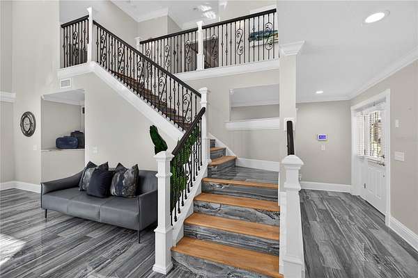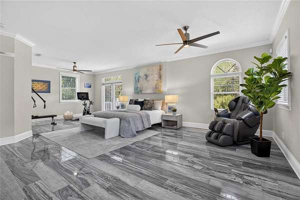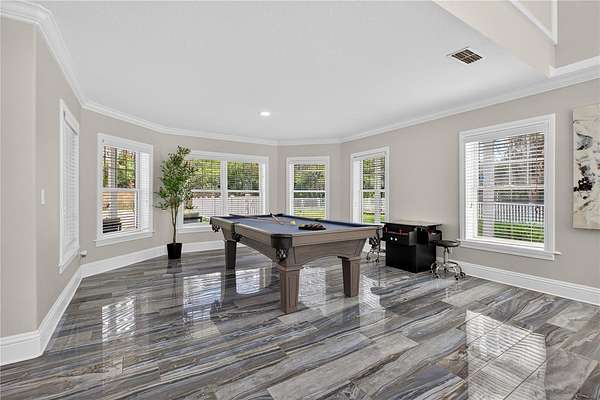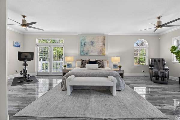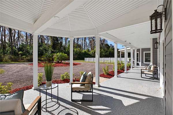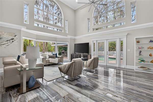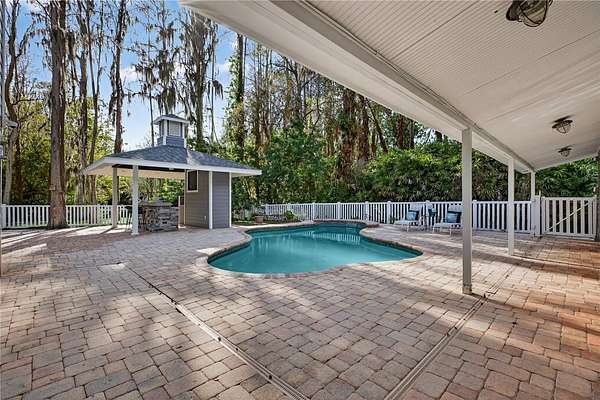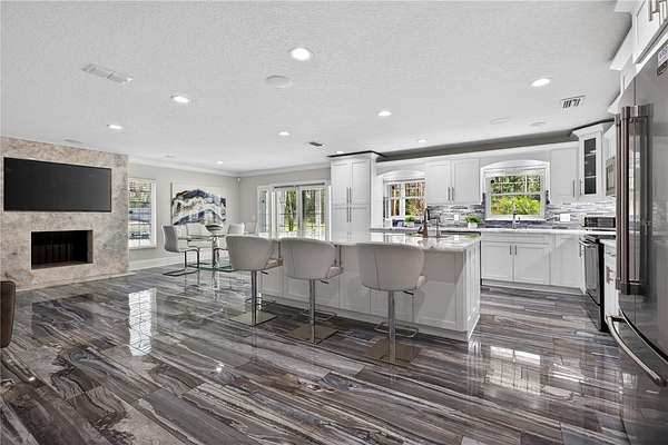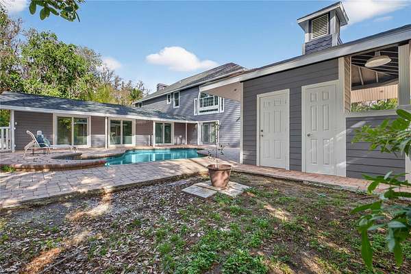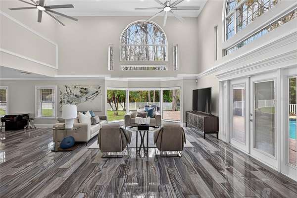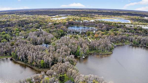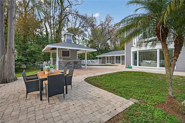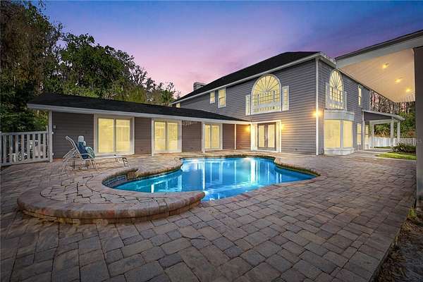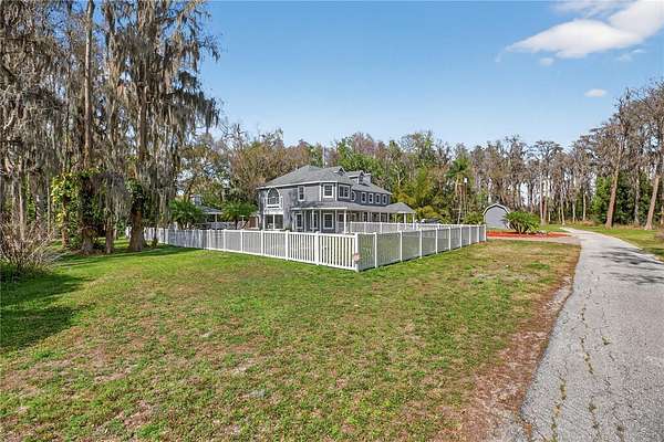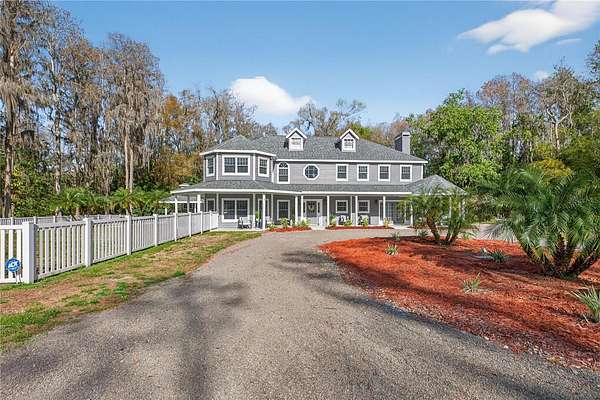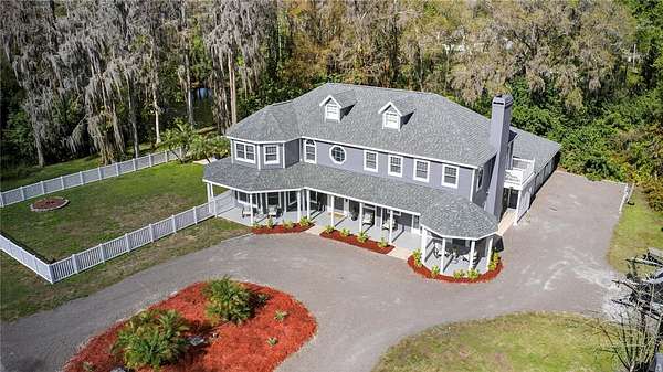 Tucked beyond a private GATED drive beneath a canopy of towering oaks, this LAKESIDE estate spans 2.8 acres (Fall 2025 survey) of pristine ski-lake frontage, offering a rare blend of privacy, acreage, and waterfront living. Set well back from the road, the 4,071 sq ft residence features 5 bedrooms, 3 full baths, 2 half baths, and a 3-car garage, surrounded by sweeping lawns, mature trees, and tranquil water views. A circular drive introduces the stately Southern-inspired façade, highlighted by an expansive wraparound porch and distinctive pavilion-style turret—an architectural presence designed for both elegance and comfort. Inside, soaring ceilings and oversized windows fill the open-concept layout with natural light. Porcelain tile flooring flows throughout the main living areas, complemented by crown molding and refined architectural detailing. The dramatic family room is anchored by a sleek fireplace feature wall and a remarkable 350-gallon built-in aquarium, creating an unforgettable focal point. Floor-to-ceiling windows frame panoramic backyard views. The home was completely remodeled in 2020. Overlooking the two-story family room with 25’ ceilings and balcony above, the chef’s kitchen is striking and functional. Crisp custom cabinetry pairs beautifully with onyx countertops and an oversized island with seating—ideal for gatherings large or small. Stainless steel appliances, designer tile backsplash, and abundant storage complete the space. Just off the kitchen, a designer half bath showcases Brazilian blue quartzite countertops, adding a bold and sophisticated touch. Three additional bedrooms and a well-appointed laundry room are conveniently located on the main level. Upstairs, the private primary suite offers exceptional space and balcony access overlooking the backyard. A custom walk-in closet with built-in organization provides both function and style. Sliding barn doors lead to the spa-inspired bath, where separate Brazilian blue quartzite vanities are complemented by high-end fixtures, designer lighting, and refined finishes throughout. Relax in the soaking tub with built-in television or enjoy the expansive glass-enclosed shower, thoughtfully designed to create a true retreat experience. A versatile upstairs bonus room provides flexible space for a home office, fitness studio, media room, or play space. Outdoor living is equally impressive. A newly paved pool deck surrounds the freeform pool, creating expansive entertaining areas framed by a charming picket fence. A covered pavilion with built-in bar, mounted television, and convenient half bath makes hosting effortless year-round. A winding backyard path leads to 32-acre Saddleback Lake, where jet skiing, boating, fishing, and peaceful sunset views await. With nearly three acres of usable land and multiple water features, this property delivers an exceptional lakefront lifestyle. Under recent appraised value! Zoned for highly regarded Schwarzkopf Elementary, Martinez Middle, and Steinbrenner High School. Significant upgrades include new roof 2022, 3 A/C units 2020, exterior paint 2025, and an energy-efficient pool pump 2025. Additional 2020 improvements include a tankless water heater, 3 impact-rated sliding glass doors, and a Culligan whole-home water filtration system. The property also offers a security system with cameras and a storage shed. Experience the privacy, space, and waterfront lifestyle this extraordinary estate offers—schedule your private showing today.
