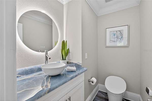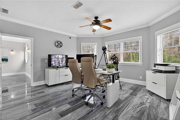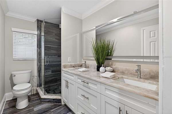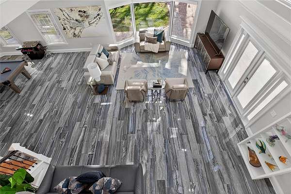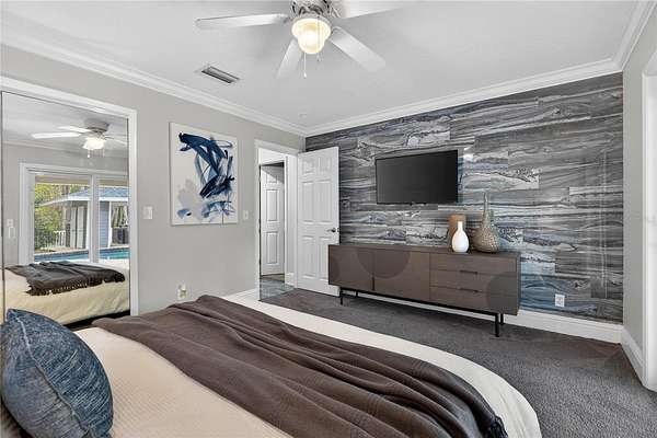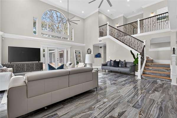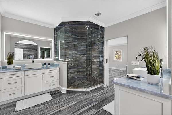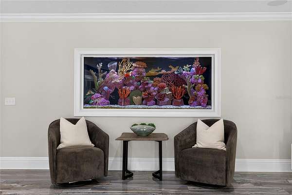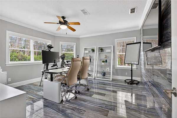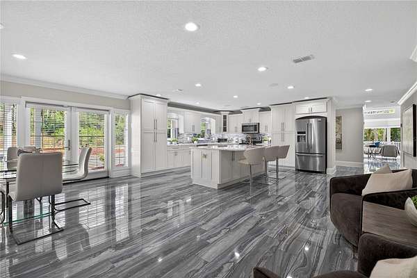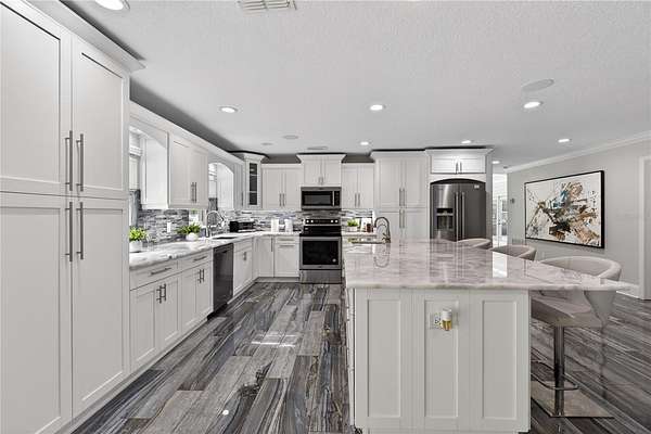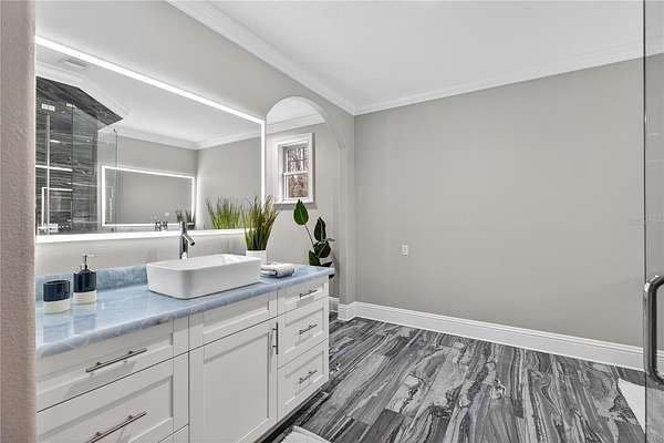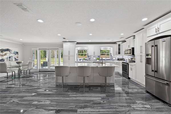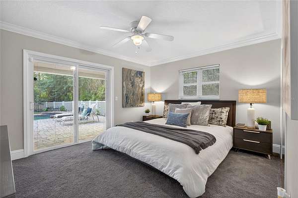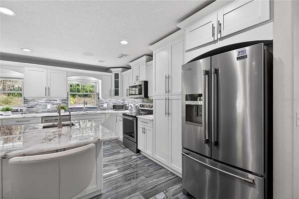 Tucked beyond a private GATED drive beneath a canopy of towering oaks, this LAKESIDE estate spans 2.8 acres (Fall 2025 survey) of pristine ski-lake frontage, offering a rare blend of privacy, acreage, and waterfront living. Set well back from the road, the 4,071 sq ft residence features 5 bedrooms, 3 full baths, 2 half baths, and a 3-car garage, surrounded by sweeping lawns, mature trees, and tranquil water views. A circular drive introduces the stately Southern-inspired façade, highlighted by an expansive wraparound porch and distinctive pavilion-style turret—an architectural presence designed for both elegance and comfort. Inside, soaring ceilings and oversized windows fill the open-concept layout with natural light. Porcelain tile flooring flows throughout the main living areas, complemented by crown molding and refined architectural detailing. The dramatic family room is anchored by a sleek fireplace feature wall and a remarkable 350-gallon built-in aquarium, creating an unforgettable focal point. Floor-to-ceiling windows frame panoramic backyard views. The home was completely remodeled in 2020. Overlooking the two-story family room with 25’ ceilings and balcony above, the chef’s kitchen is striking and functional. Crisp custom cabinetry pairs beautifully with onyx countertops and an oversized island with seating—ideal for gatherings large or small. Stainless steel appliances, designer tile backsplash, and abundant storage complete the space. Just off the kitchen, a designer half bath showcases Brazilian blue quartzite countertops, adding a bold and sophisticated touch. Three additional bedrooms and a well-appointed laundry room are conveniently located on the main level. Upstairs, the private primary suite offers exceptional space and balcony access overlooking the backyard. A custom walk-in closet with built-in organization provides both function and style. Sliding barn doors lead to the spa-inspired bath, where separate Brazilian blue quartzite vanities are complemented by high-end fixtures, designer lighting, and refined finishes throughout. Relax in the soaking tub with built-in television or enjoy the expansive glass-enclosed shower, thoughtfully designed to create a true retreat experience. A versatile upstairs bonus room provides flexible space for a home office, fitness studio, media room, or play space. Outdoor living is equally impressive. A newly paved pool deck surrounds the freeform pool, creating expansive entertaining areas framed by a charming picket fence. A covered pavilion with built-in bar, mounted television, and convenient half bath makes hosting effortless year-round. A winding backyard path leads to 32-acre Saddleback Lake, where jet skiing, boating, fishing, and peaceful sunset views await. With nearly three acres of usable land and multiple water features, this property delivers an exceptional lakefront lifestyle. Under recent appraised value! Zoned for highly regarded Schwarzkopf Elementary, Martinez Middle, and Steinbrenner High School. Significant upgrades include new roof 2022, 3 A/C units 2020, exterior paint 2025, and an energy-efficient pool pump 2025. Additional 2020 improvements include a tankless water heater, 3 impact-rated sliding glass doors, and a Culligan whole-home water filtration system. The property also offers a security system with cameras and a storage shed. Experience the privacy, space, and waterfront lifestyle this extraordinary estate offers—schedule your private showing today.